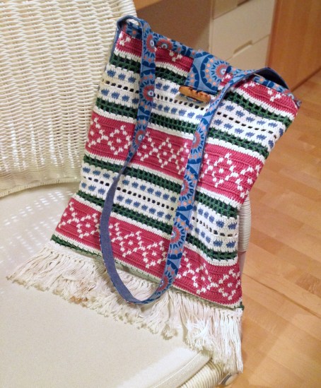 Ett väldigt roligt projekt som jag fick en idé till var en axelväska av en härlig virkad löpare i riktig retro/hippie-stil!