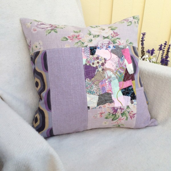 Den roligaste tekniken för mig när jag skapar kuddar, väskor, grytlappar m.m. är patchwork, eller lapptäcksteknik på svenska! Det är som att måla med tyg, jag plockar ut och väljer ur min samling med textilier och pusslar ihop en färgkombination som jag känner för, kanske jag utgår från ett mönstrat fint tyg, eller ett påbörjat mindre projekt. Så var det när jag sydde både kudden Montana (i denim) och kudden Bella (i pasteller) och det är sååå roligt! Jag provar en teknik, t.ex. ”Quilt-as-you-go” där man syr fast tygbitar på ett mellanlägg vart eftersom, liksom bygger på tills man täckt hela biten mellanlägg, eller så lägger jag småbitar huller om buller och syr fast dem med sömmar kors och tvärs. Till de här två kuddarna tog jag såna prov-/test-bitar och använde som del i ett patchwork och dekorerade sen på olika sätt beroende på vilket uttryck jag vill få fram. De är helt olika i stil men lika älskansvärda båda två!