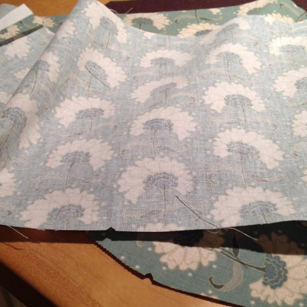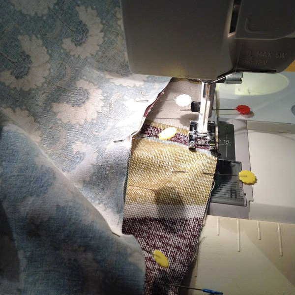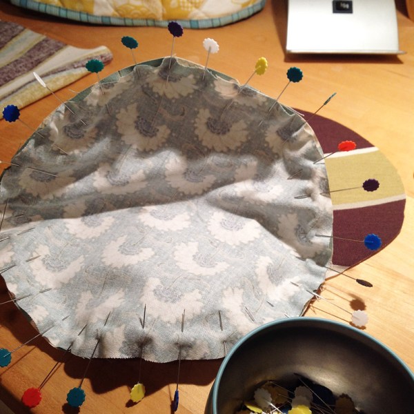 Nåla fast bottencirkeln mot korgens vägg, nåla först markeringarna och fördela sen tyget jämnt emellan, nåla tätt så riskerar du inte att få veck när du syr.