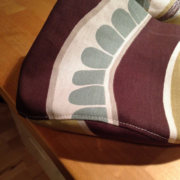 Vänd nu alltsammans ut- och in genom öppningen i sömmen, fingerpressa (eller pressa med strykjärn) så att kanten blir fin och jämn, innertyget ska dölja yttertyget pyttelite eftersom man viker ner kanten. Vik in kanterna med 1 cm längs öppningen du vände igenom och nåla ihop och fortsätt nåla runt hela överkanten.
