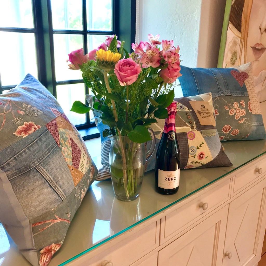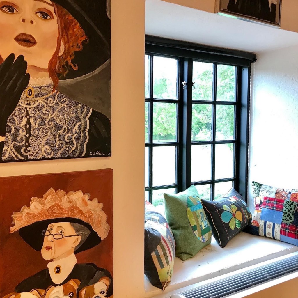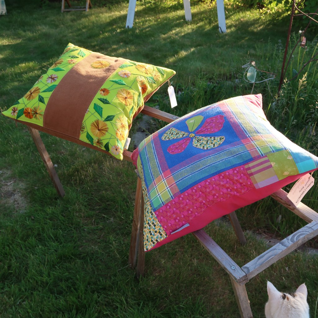 Blommor och bubbel på vernissage-dagenJag och Sanna EkmanKuddarna gör sig fint i de djupa fönsternischernaSenaste alstret, kudden Ziggy! Bakom kudden Pixie.