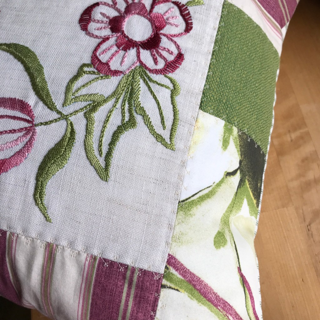 Sen börjar skapandeprocessen med att plocka fram tyger ur mina skåp och lådor som jag tror kan passa till. Enfärgade och mönstrade, lite olika strukturer men i naturmaterial eftersom broderiet var på linne. Sen mäta hur stora tygbitarna behövde vara för att få ihop en kvadrat som passar innerkudden på 50 x 50 cm. Nästa steg i processen blir att flytta runt bitarna så de bildar en vacker, estetiskt tilltalande ram runt broderiet så det lyfts fram och kommer till sin rätt. Och sen foga samman allt, pressa och sy dekorsömmar över skarvarna vilket jag tycker ger ett extra lyft. Slutligen skära rent kanterna så storleken blir exakt rätt och sy en overlocksöm runtom.