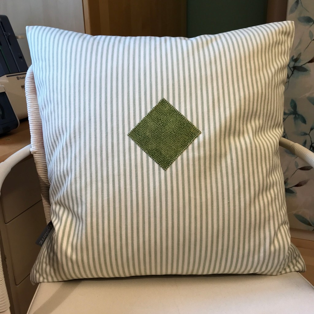 För att det ska bli ett kuddfodral måste förstås en baksida till och då brukar jag välja ett tyg som passar till framsidan utan att ta för mycket fokus. På den här kudden blev det ett smalrandigt i grönt och vitt som även fanns med på framsidan. En grön ruta på diagonalen som en liten detalj och baksidan var färdig. Slutligen ett blixtlås och hopsömnad av fodralet, vända det rätt, pressa och så stoppa i innerkudden, stänga blixtlåset och puffa upp. En färdig kudde! Och de får alltid ett namn – SOMMARRO – fick den här heta!