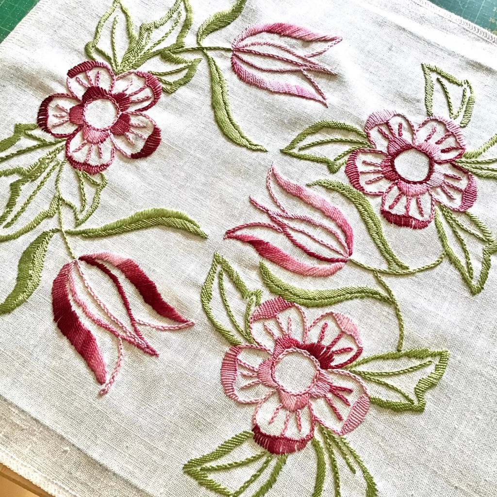 Jag är ständigt på jakt efter vackra gamla textilier, gärna handarbetade, som jag kan använda mig av när jag skapar en ny kudde. Och i somras var jag på en gatuloppis i Vingåker med många stånd utefter gatan, varmt och soligt och fullt med folk. Jag dras förstås till allt textilt och letade noga efter någon godbit – och så fick jag syn på en liten kudde i linne med ett vackert handbroderi i rosa och gröna toner på framsidan. Kudden var liten och platt men broderiet var såå fint gjort och jag såg framför mig hur vackert det skulle göra sig tillsammans med matchande tyger i en större kudde, 50 x 50 cm som jag brukar använda mig av.