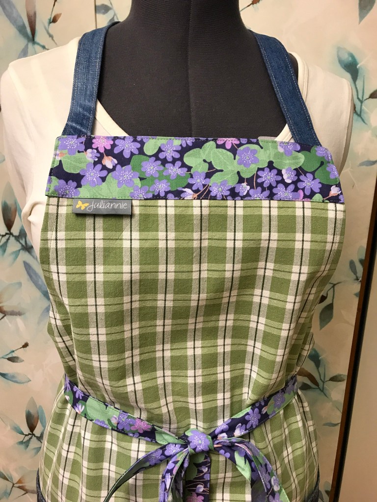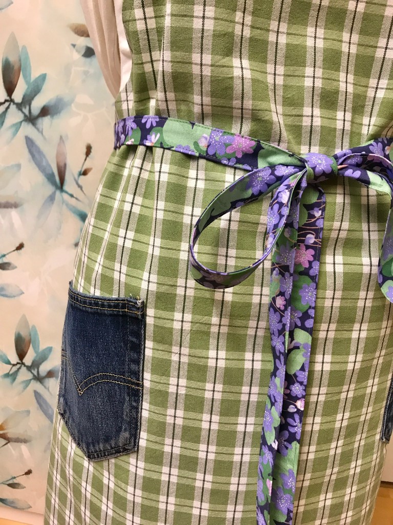 Till jul fick jag också beställning på ett förkläde, samma stil som jag brukar sy som förklädet Laura, men i grönt och blått och lite längre knytband! Vi bestämde detaljer av denim så fickorna kommer från ett par avlagda Levisjeans. Och så här blev det!