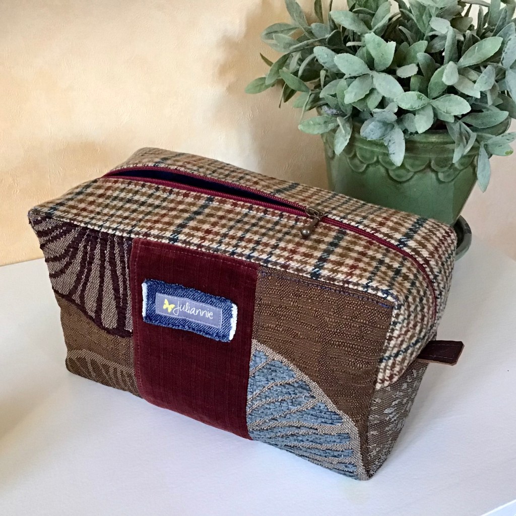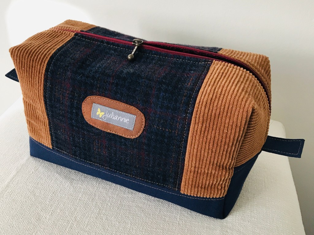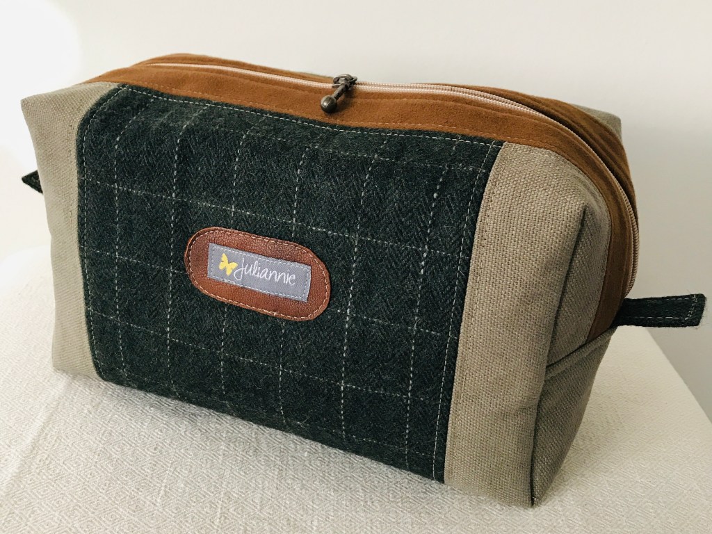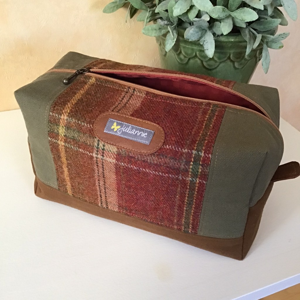 Många necessärer har skapats här på By Juliannie, men nästan alla har varit riktade till kvinnor. Färgglada eller pastellromantiska eller lite tuffare i denim, men ganska feminina i sin stil. Men så kom det en beställning från en man som ville ha en ganska rymlig necessär och som skulle passa hans stil. Mitt val blev engelsk countrystil med tweedrutigt ylle i kombination av andra mer rustika tyger.