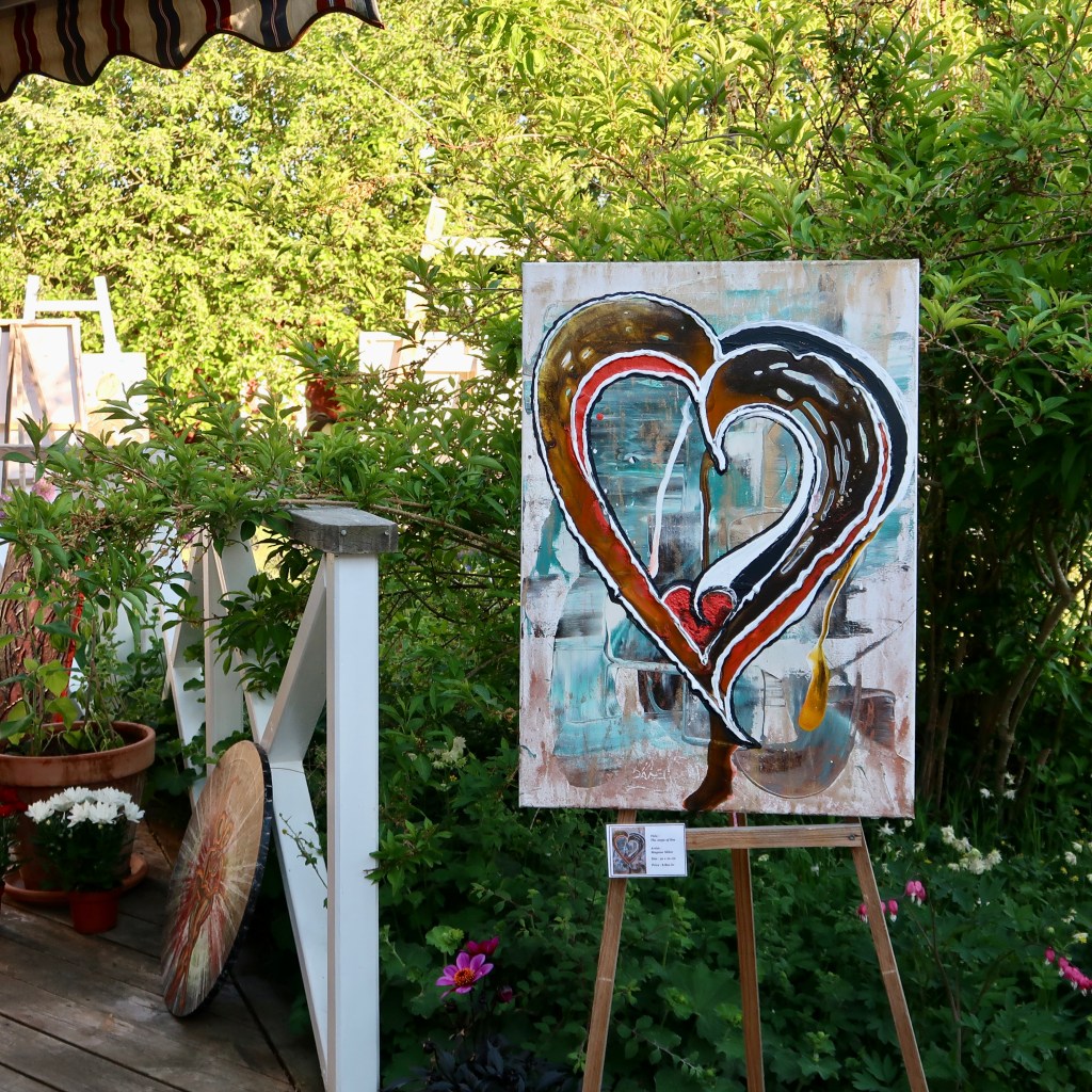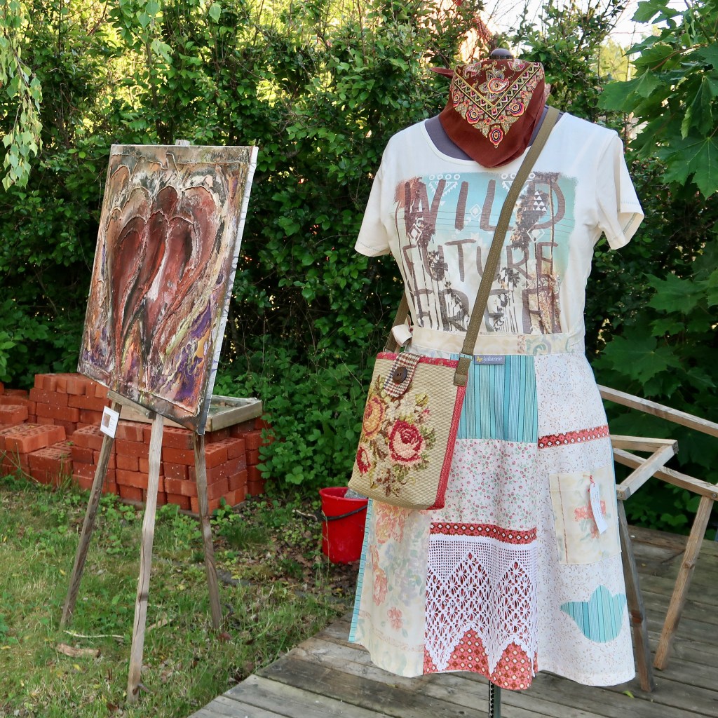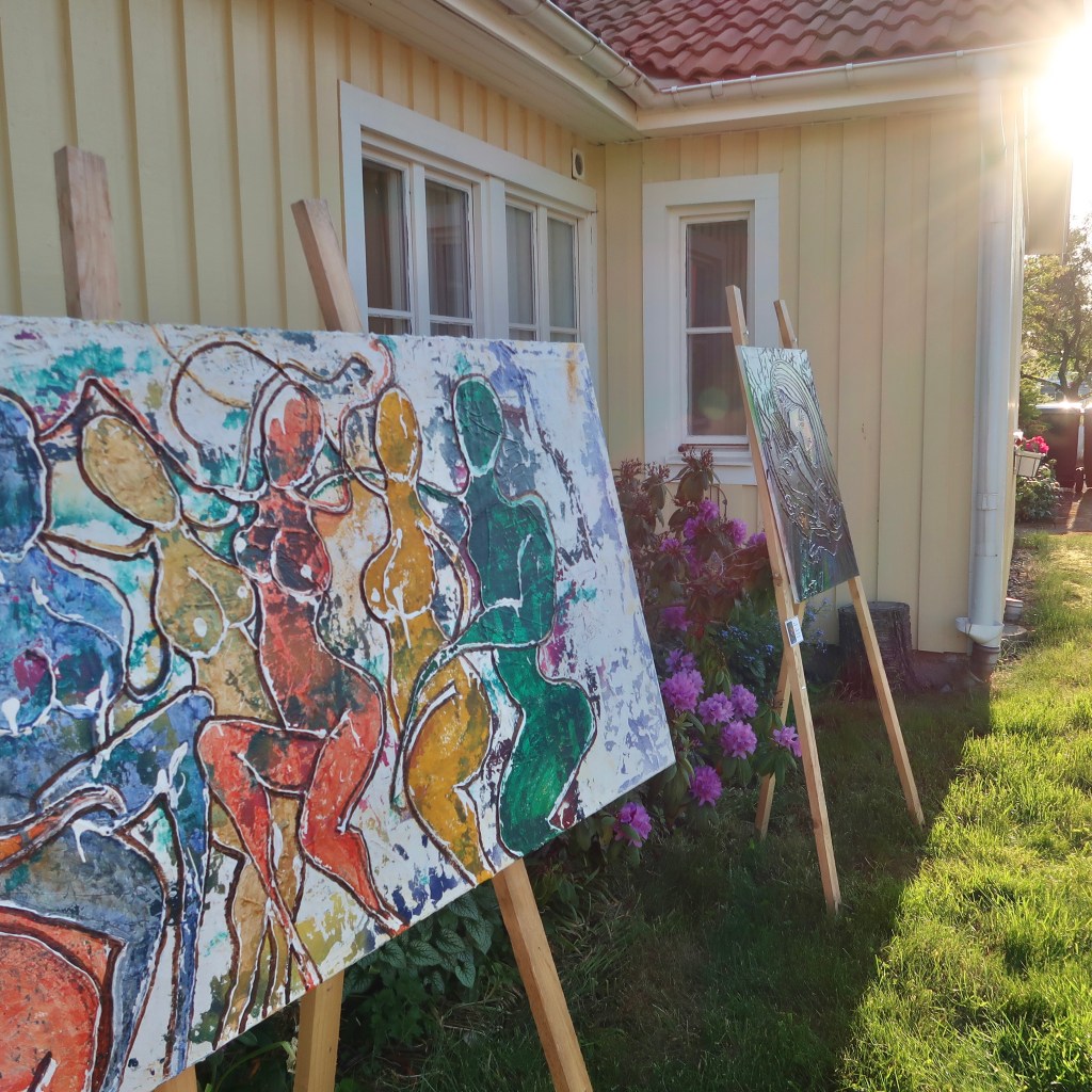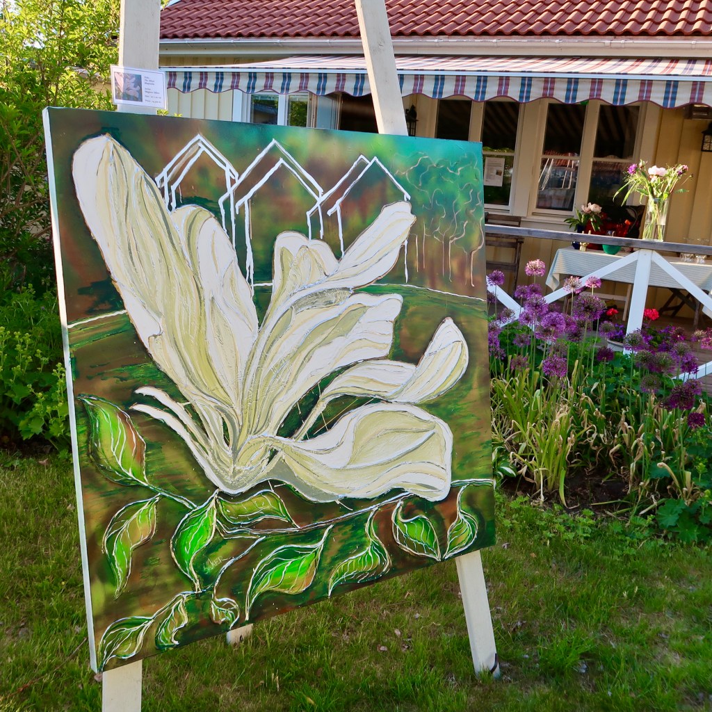 I juni när sommaren slagit ut i sitt finaste flor öppnade vi för nionde gången upp vår trädgård för att visa upp och sälja vår konst för besökare! Vädret var strålande, soligt och varmt och besökare droppade in i en lagom ström så man hann visa runt och prata med alla. Vi hade öppet både lördag och söndag och många alster fick nya hem, kuddar, väskor, små flickklänningar, grytlappar och förstås konst av min man Magnus Säker.