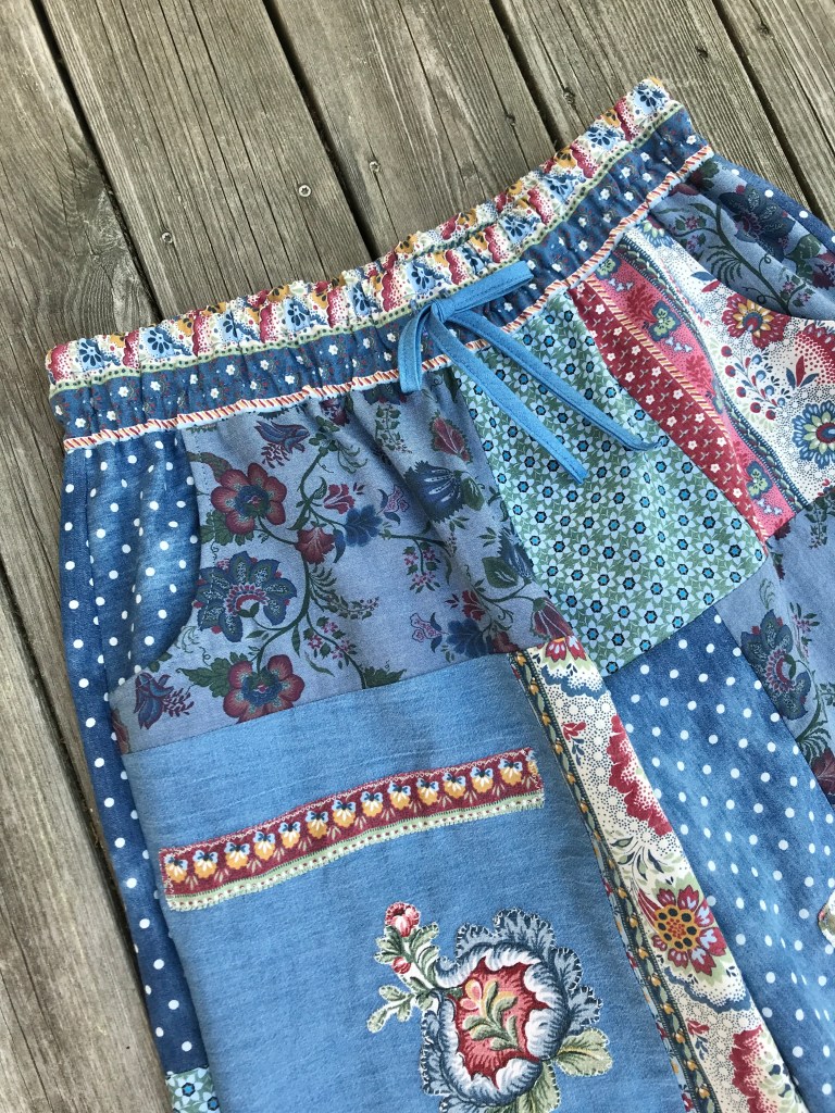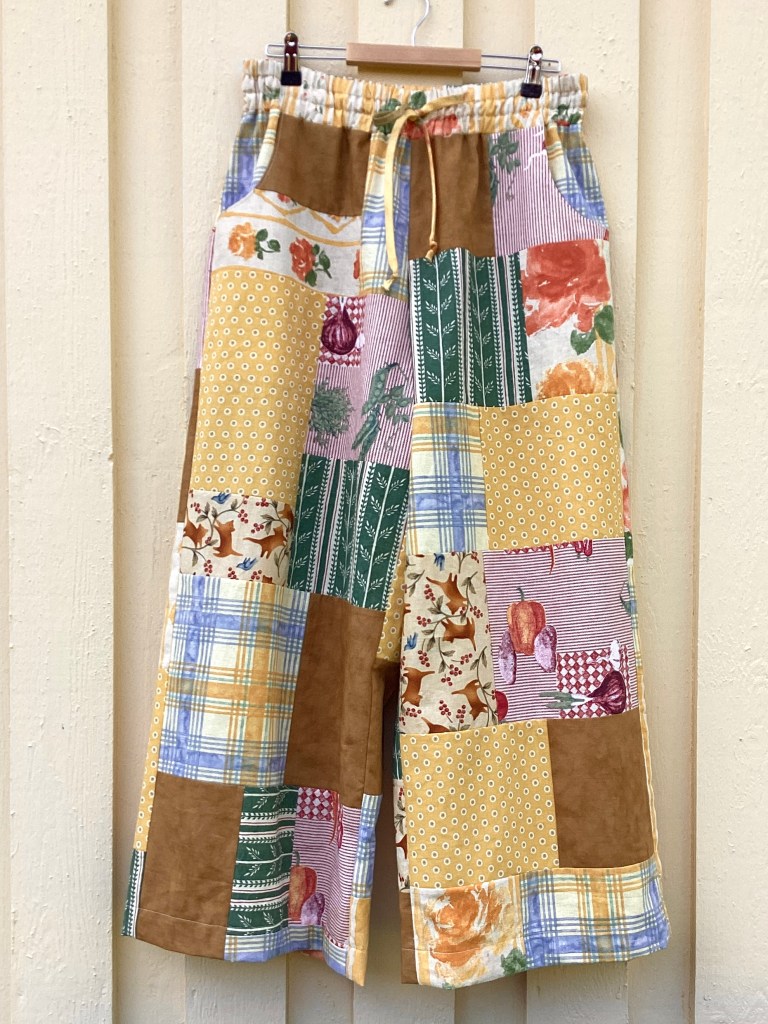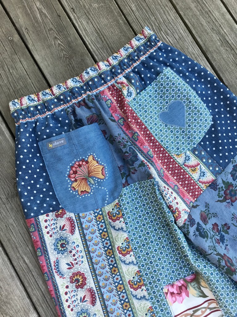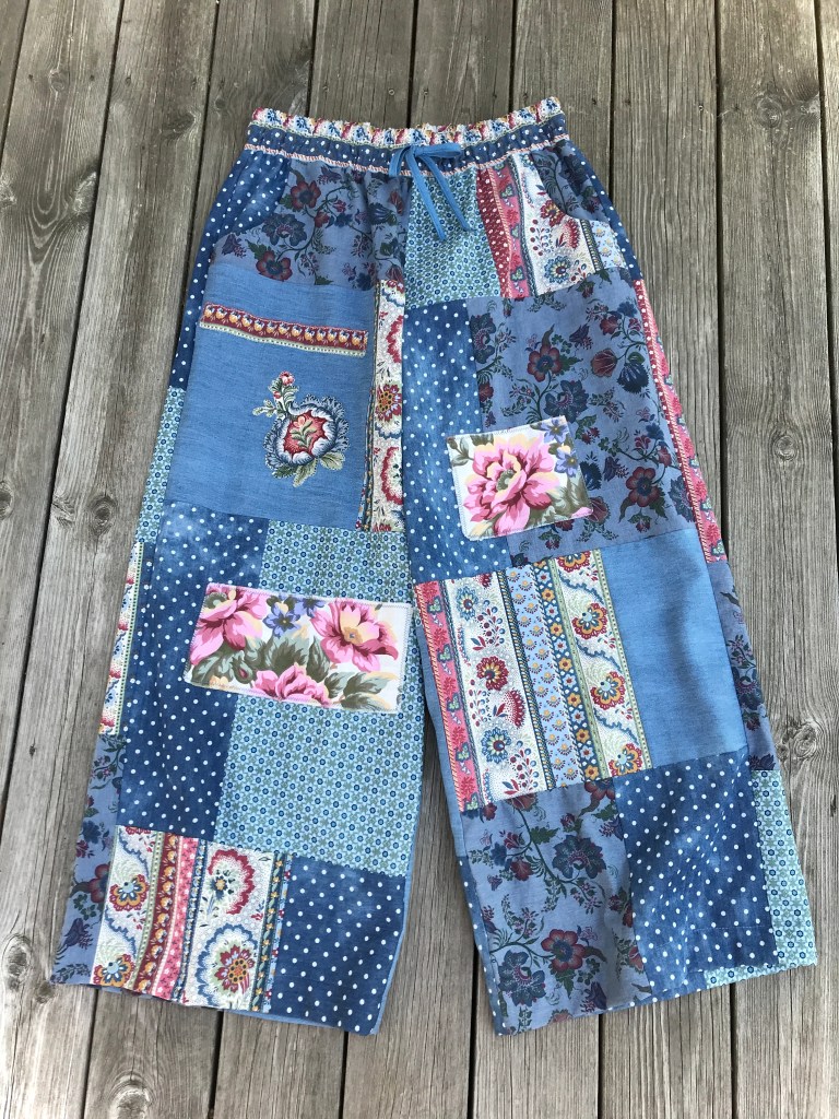 Att skapa kläder i lappteknik eller patchwork har länge varit en av mina passioner! De första patchworkplaggen för By Julianne var omlottkjolar, sen kom jackor och nu har jag även börjat med vida byxor med resår och dragsko i midjan. Rymliga isticksfickor fram och två bakfickor och skön, löst sittande modell, så somrigt och härligt! De är förstås sydda av återbruksmaterial och spillbitar som alltid.