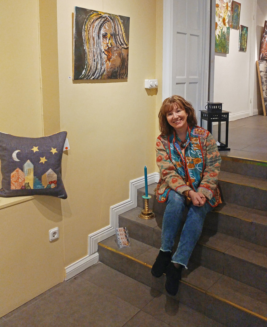 Blommor och bubbel på vernissage-dagenJag och Sanna EkmanKuddarna gör sig fint i de djupa fönsternischernaSenaste alstret, kudden Ziggy! Bakom kudden Pixie.