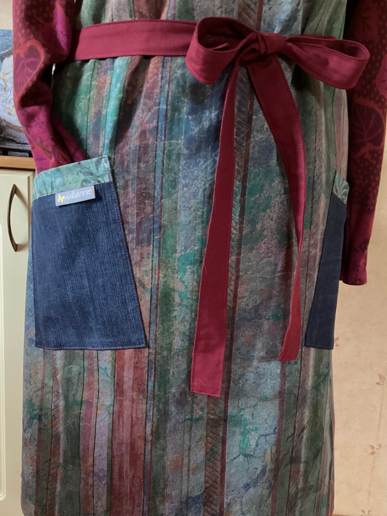 ENGLISH: A lovely apron made of a sturdy, durable cotton fabric in beautiful shades of blue, green, teal, burgundy, and reddish-brown. The top of the bib and the pockets are made of denim, with a small decorative piece of a batik-dyed fabric that matches the main fabric. The ties and neck strap are made of burgundy cotton, which also matches the burgundy in the fabric. The pockets are large and practical, placed slightly diagonally for comfortable use.