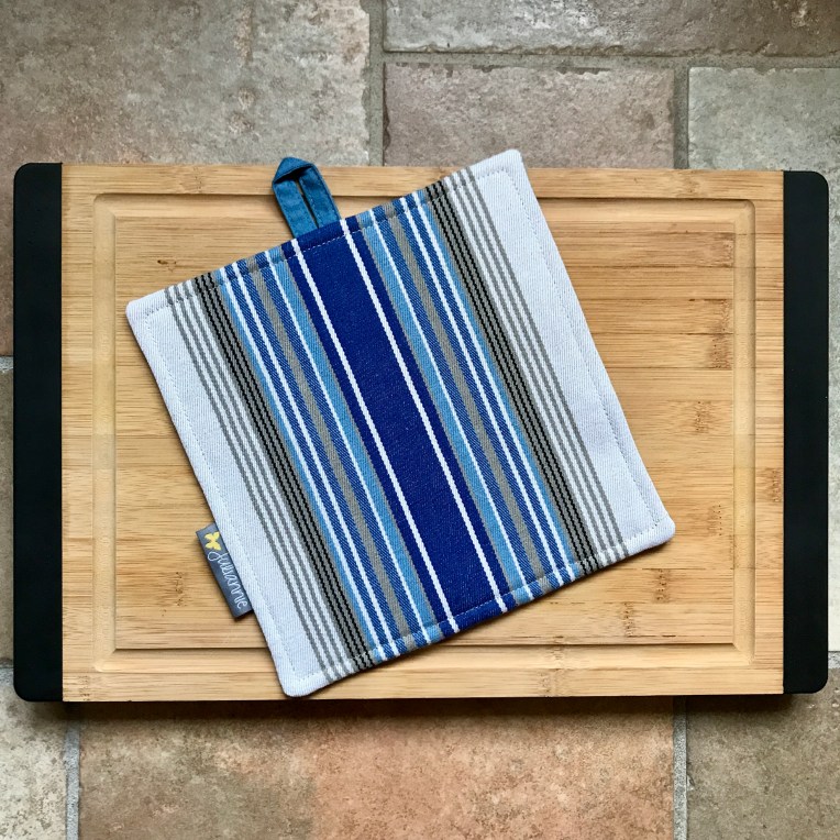 ENGLISH: A simple geometric pattern in off-white on a blue speckled background on one side of this stylish potholder, the material is a linen blend. The other side is woven in stripes of various blue, gray, and off-white tones. (see picture below). Interlining is two layers of heat-insulating wadding.