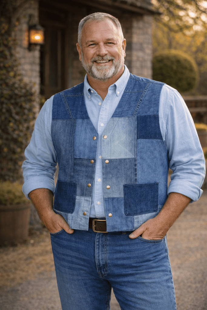 För mannen som gärna klär sig lite personligt i unika plagg som ingen annan har – en rak, bekväm väst i patchwork av denim i olika blå nyanser.