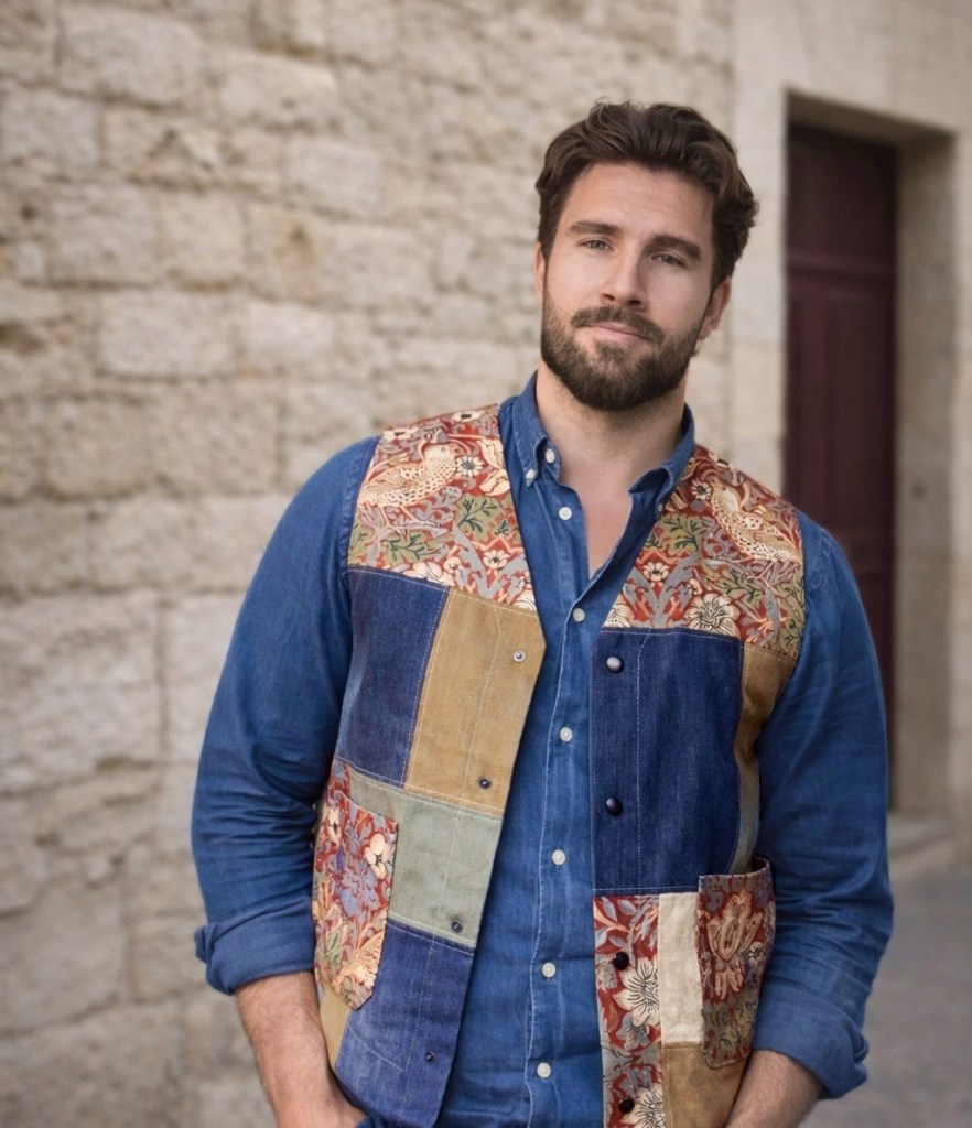 ENGLISH: For the man who likes to dress a little personally in unique garments that no one else has – a straight, comfortable vest/gilet in patchwork with jacquard in the well-known pattern ”Strawberry Thief” by William Morris. The patterned fabric is accompanied by dark denim and sand-colored twill plus a couple of other materials in matching tones. Light coloured topstitching all around.