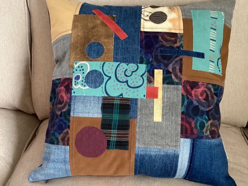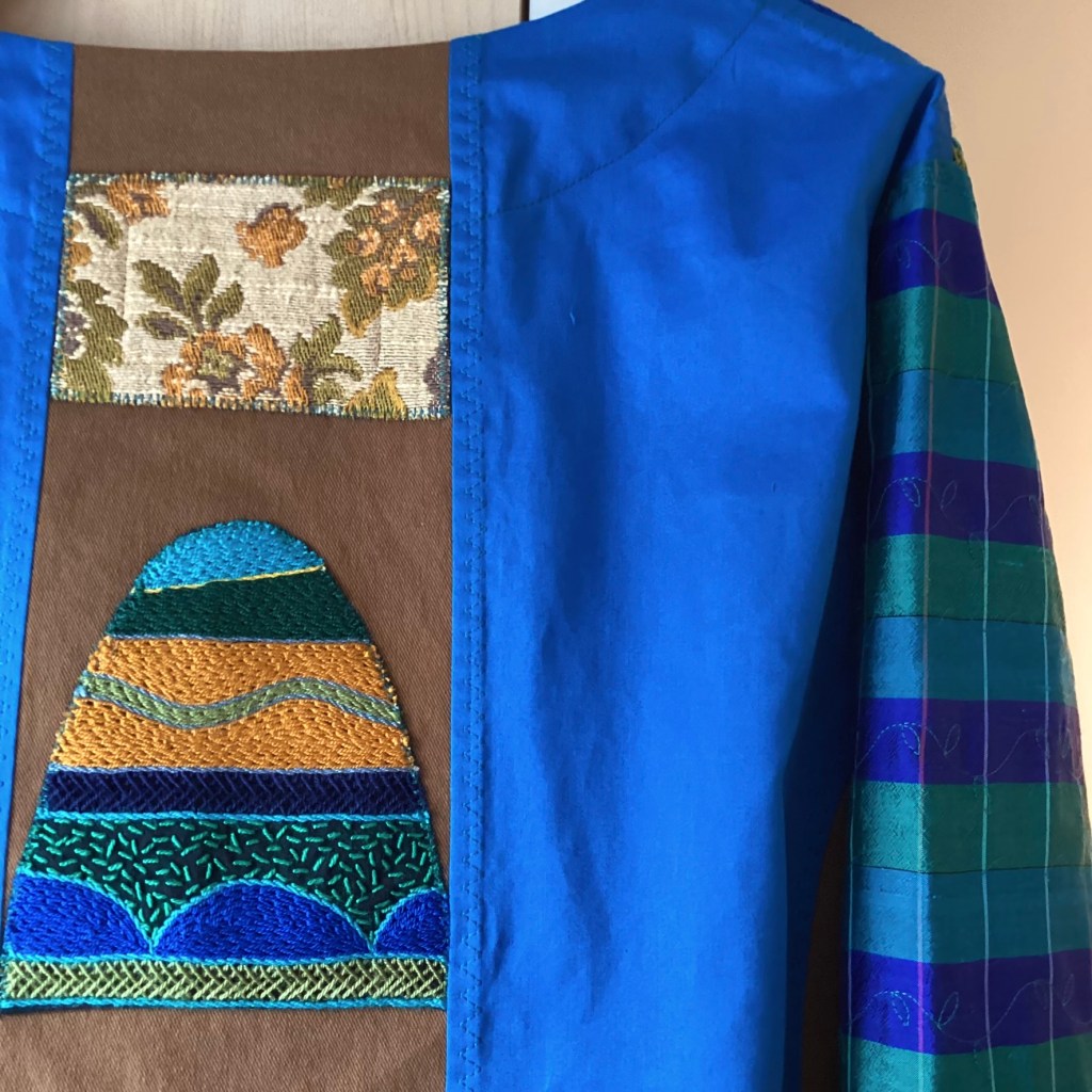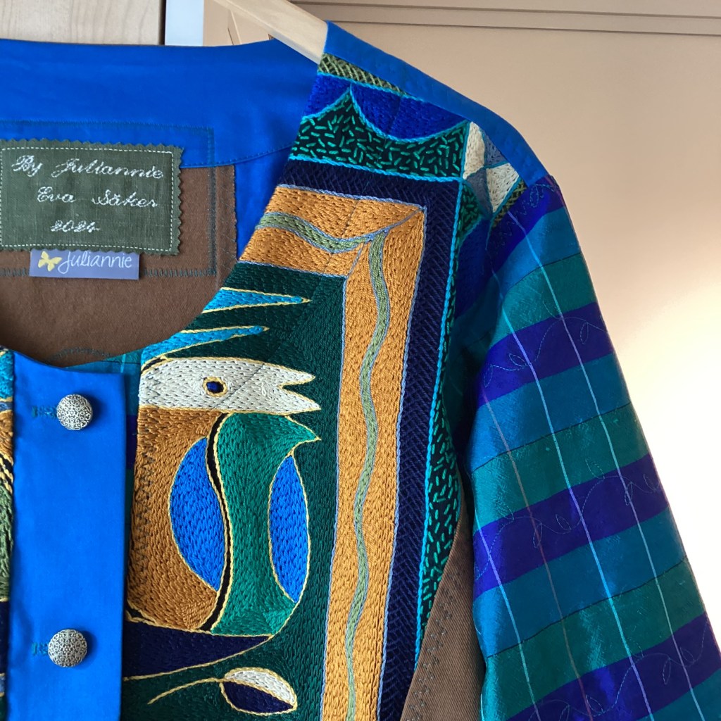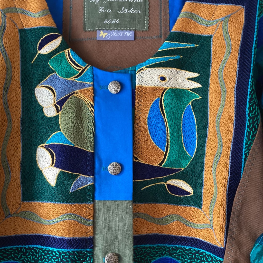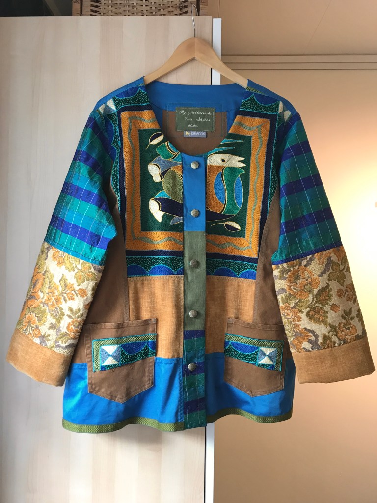 Det här är en riktig statement-jacka med sin lysande blå färg mot det fantastiska broderiet på framstycket som dessutom är handgjort och signerat! De övriga färgerna i broderiet har också matchats med ljuvliga textilier, bl a det turkos-/blårutiga i siden. En lite rustikare bomullstwill i kanelbrunt blir en kontrast mot de lite glansiga mjuka tygerna. Bitar av broderiet har fått pryda fickorna och bakstycket. Alla ingående textilier är återbruk och spillbitar som alltid.