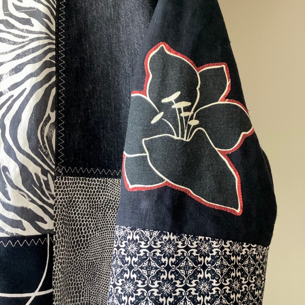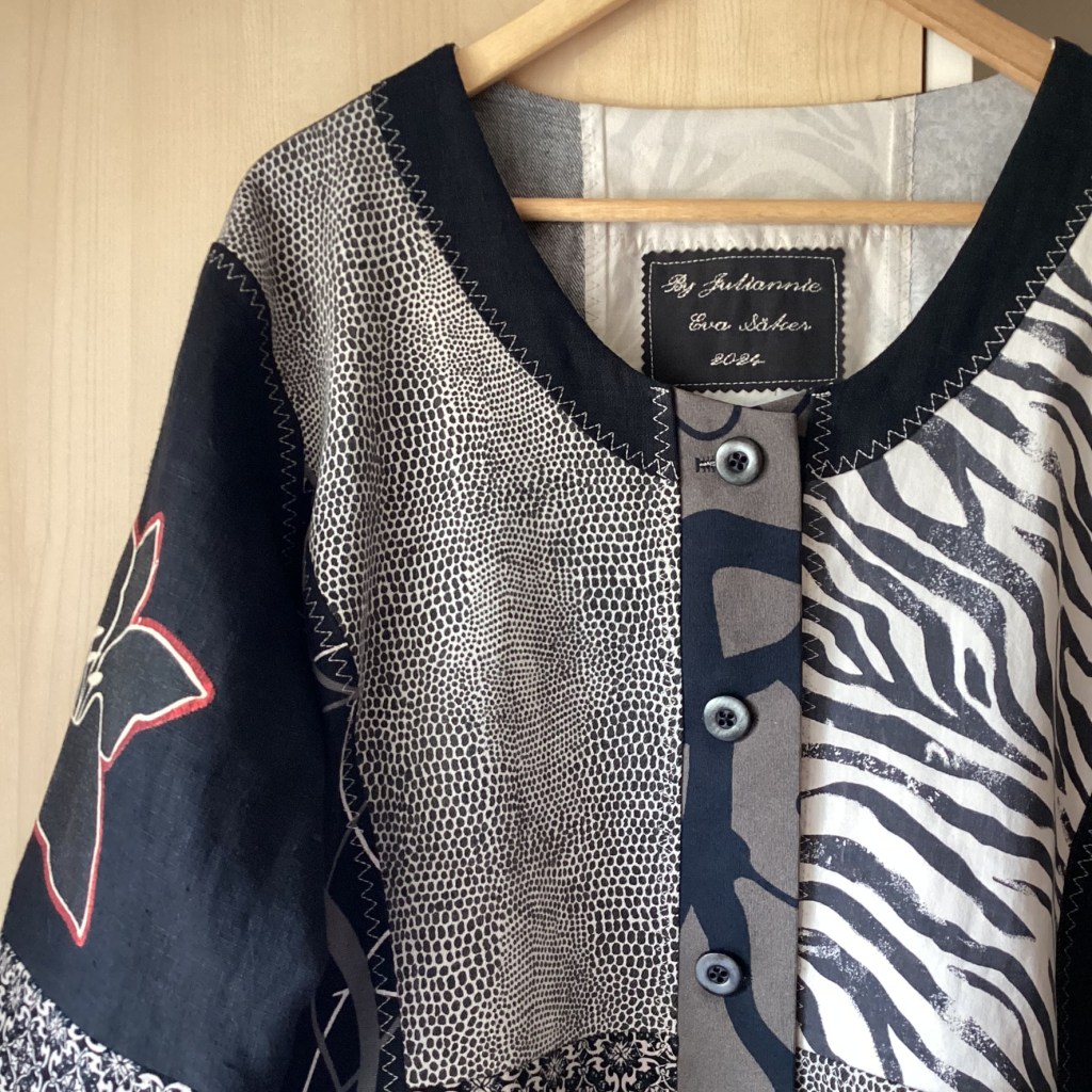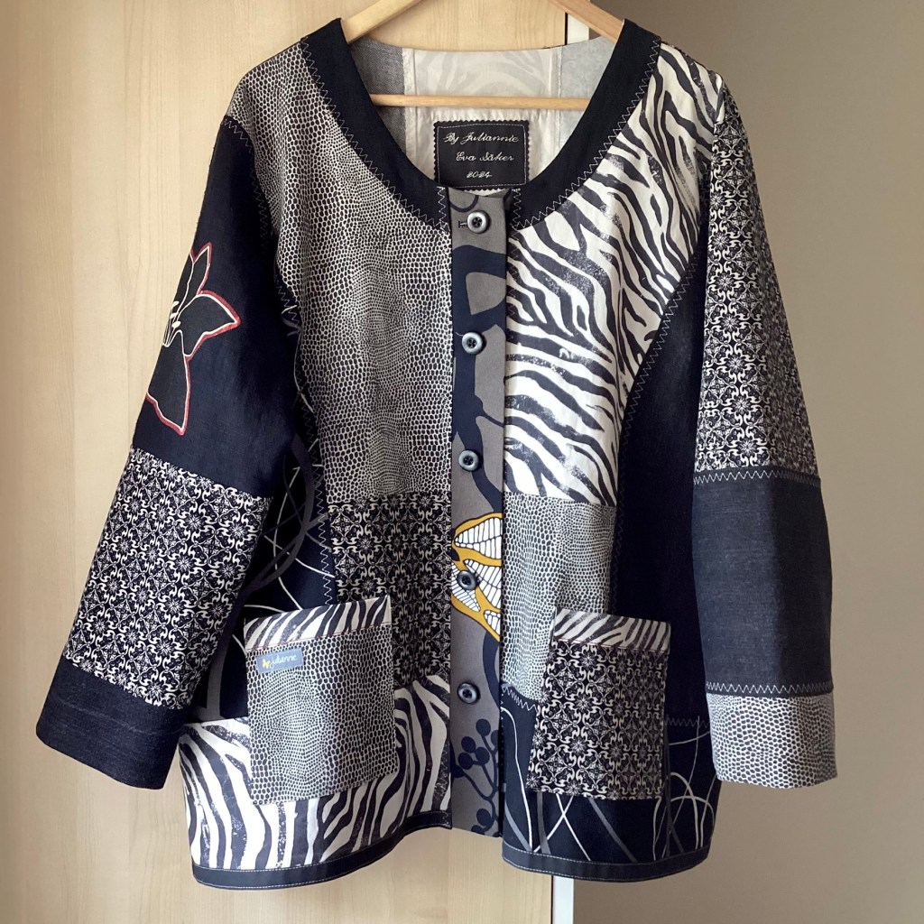 En härlig jacka i monokrom färgskala – svart, gråsvart och offwhite. Men som en liten överraskning dyker det upp lite senapsgult på knapplisten och en röd kant på den applicerade blomman på ärmen. Det lilla röda tas upp med en röd stickning på fickorna och även runt applikationen på ryggen. Som alltid är alla ingående textilier återbruk och spillbitar, linne, denim och bomullstwill.