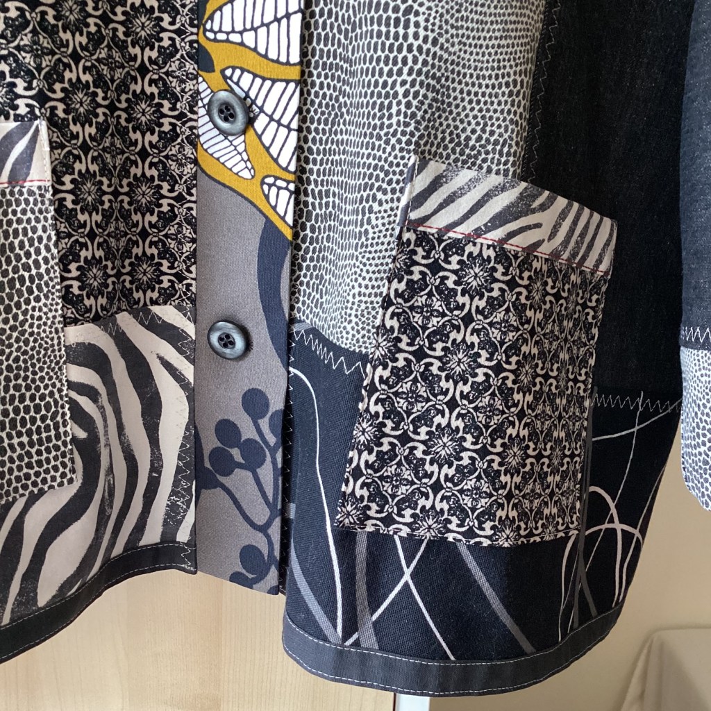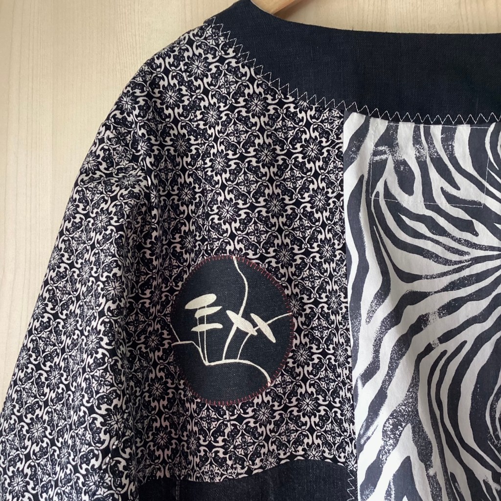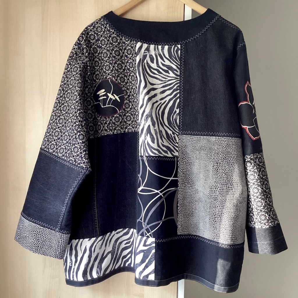 En härlig jacka i monokrom färgskala – svart, gråsvart och offwhite. Men som en liten överraskning dyker det upp lite senapsgult på knapplisten och en röd kant på den applicerade blomman på ärmen. Det lilla röda tas upp med en röd stickning på fickorna och även runt applikationen på ryggen. Som alltid är alla ingående textilier återbruk och spillbitar, linne, denim och bomullstwill.