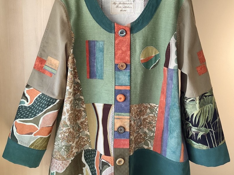 ENGLISH: For those of you who like to dress in something unique that not everyone has, a jacket created as a patchwork in mainly cotton textiles in different shades of green and blue-green! The complementary colours rust red and terracotta highlight the blue-green. The model is in a spacious A-shape with a comfortable fit and is fastened with five large buttons, all different but in matching colors. The cuffs are sewn in double fabric and can be folded up if desired. The jacket is unlined and the seam allowances are sewn down with a decorative threestep zigzag stitch.