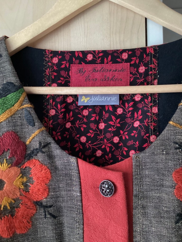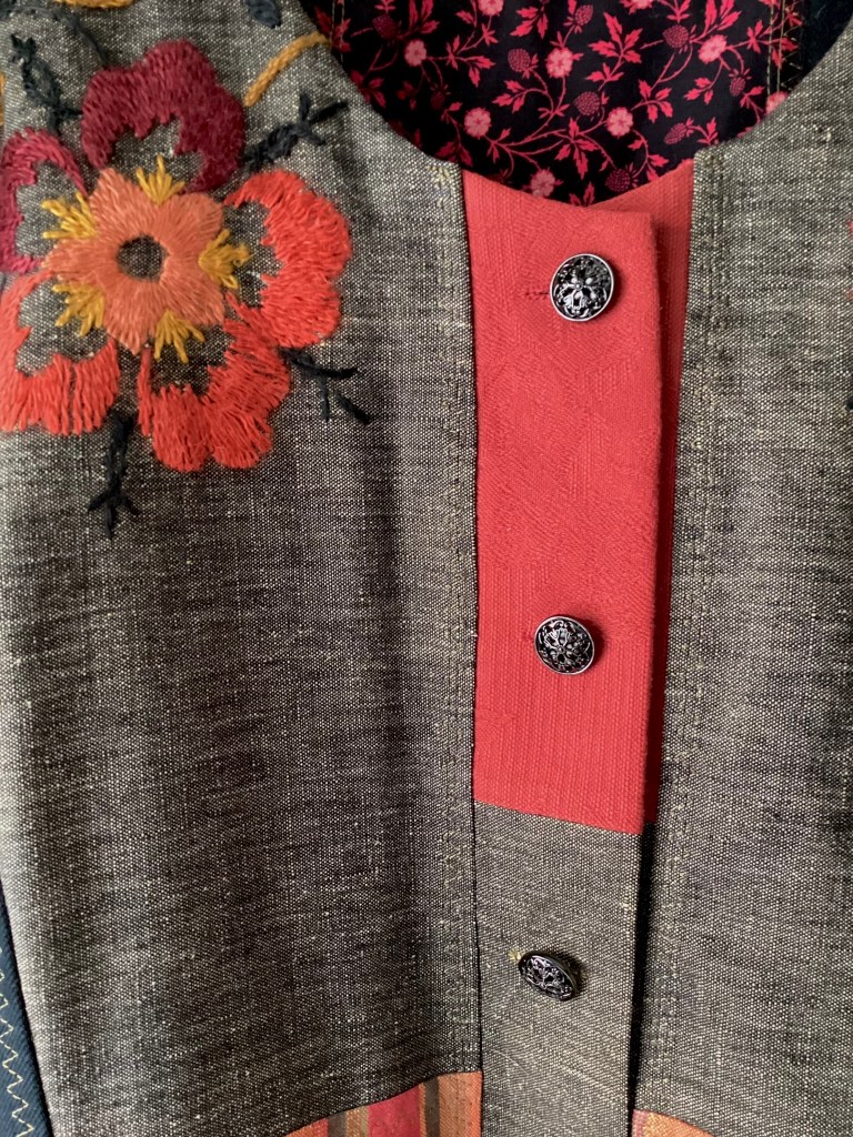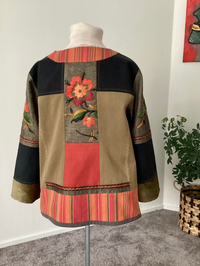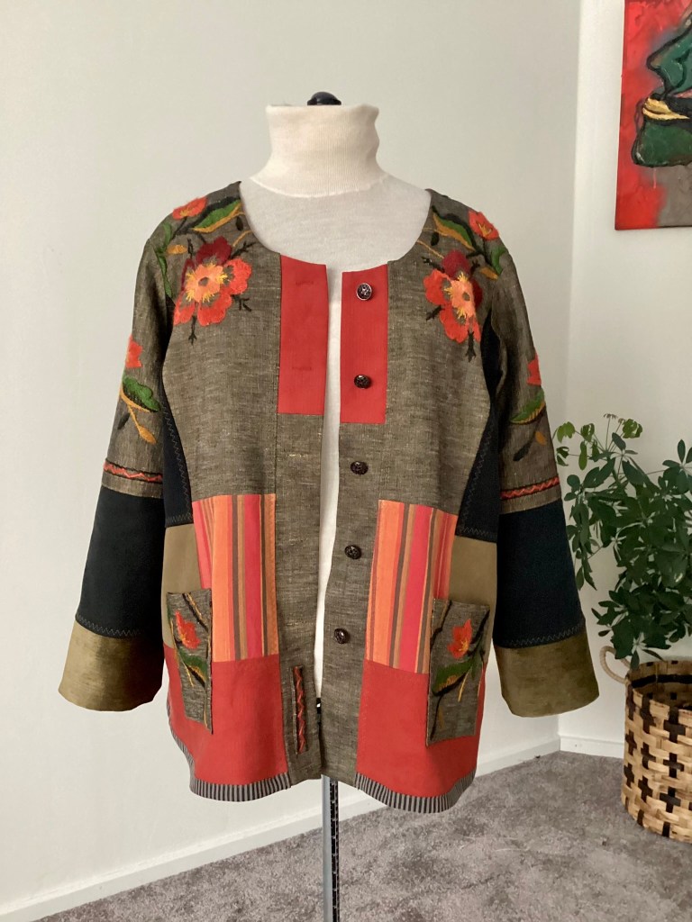 För dig som gärna klär dig i något unikt som inte alla har! Den här jackan är skapad som ett patchwork med utgångspunkt från en vacker gammal broderad duk i gråbrunt linne. Broderierna är fantastiskt vackra i lysande färger som tas upp i den ingående textilierna och har tagits tillvara så mycket som möjligt i jackan. De övriga textilierna är återbruk i bomull och vid ärmsluten, spill av möbeltyg i skimrig sammet. Sammeten är fodrad med det rödrandiga tyget och kan alltså vikas upp för att få en annan look. Modellen är i en rymlig och bekväm A-linjeform och knäpps med fem filigranliknande metallknappar. Jackan är ofodrad förutom de broderade partierna och sömsmånerna är genomgående nedsydda med en dekorativ trestegssicksack. På framsidan finns två utanpåfickor.