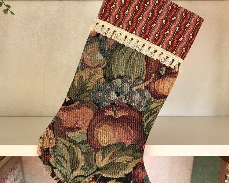 Den här mysiga julstrumpan är sydd av ett gobelängtyg med frukter och blad i varma, vackra färger. Och så en liten frans som dekor intill kanten av bomullstyg i gammalrosa. Fodret är randigt i matchande färger. Precis som alla By Juliannies produkter är den här också sydd på ett klimatvänligt sätt av återbrukstextilier eller spillbitar och det finns bara ett unikt exemplar.