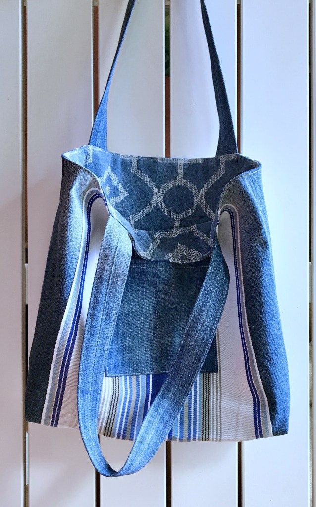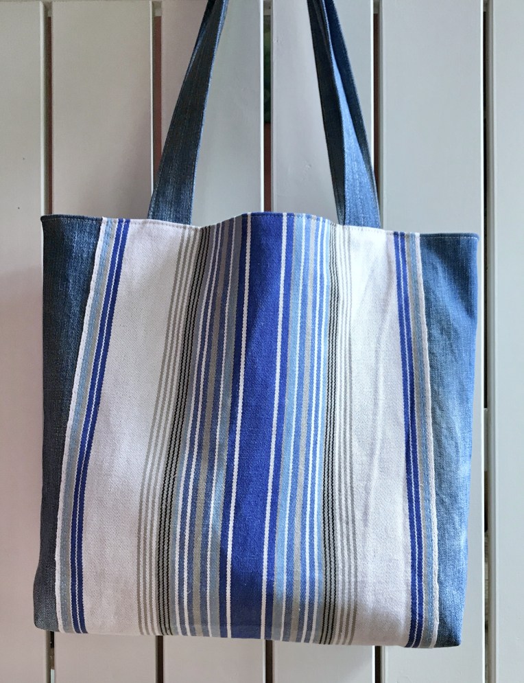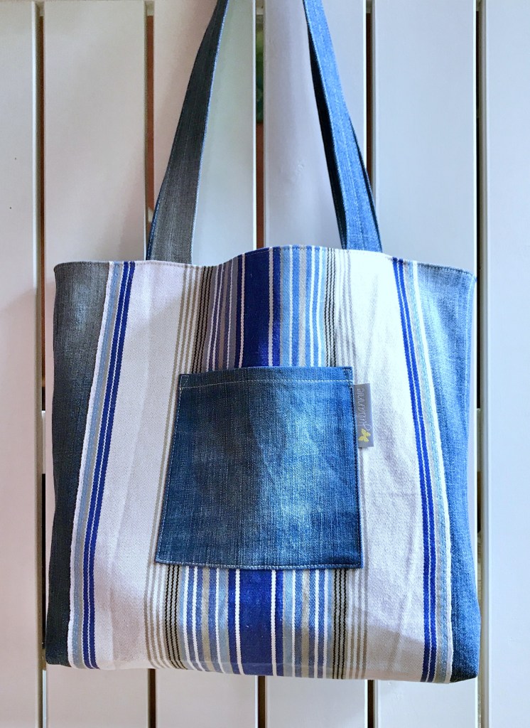 ENGLISH: A spacious, durable bag sewn from a woven runner in blue and light gray tones with a bit of white. It is combined with nice, slightly worn denim that matches the blue tones of the runner so well. The lining is made of a linen blend in subdued blue with a geometric print in off-white. The bag has a denim pocket on the outside and an inner pocket in the lining fabric, large enough to hold, for example, a mobile phone. The handles, also in denim, are long enough to carry the bag on the shoulder.