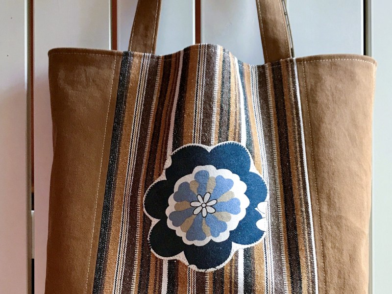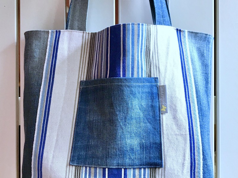 ENGLISH: A spacious, durable bag sewn from a woven runner in blue and light gray tones with a bit of white. It is combined with nice, slightly worn denim that matches the blue tones of the runner so well. The lining is made of a linen blend in subdued blue with a geometric print in off-white. The bag has a denim pocket on the outside and an inner pocket in the lining fabric, large enough to hold, for example, a mobile phone. The handles, also in denim, are long enough to carry the bag on the shoulder.