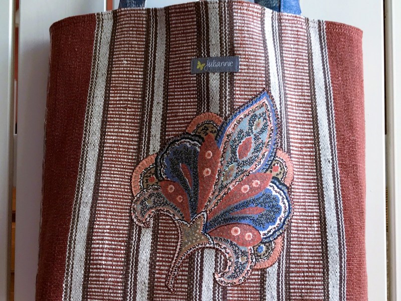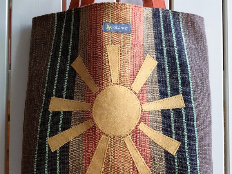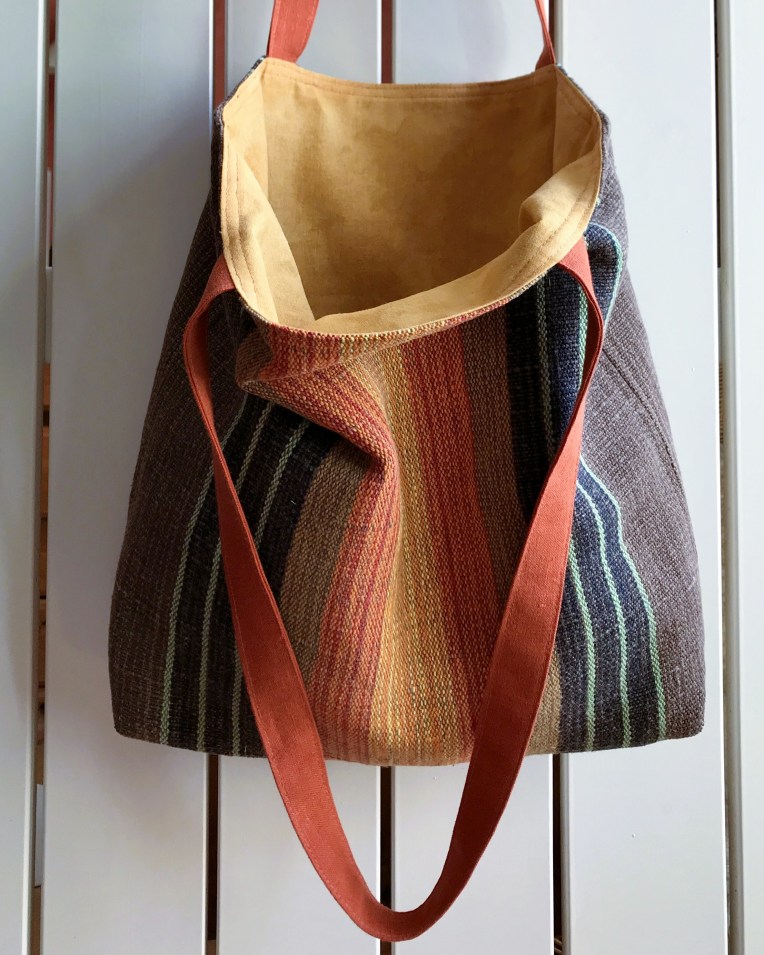 ENGLISH: A spacious, sustainable bag made of a woven runner in lovely autumn colors, yellow, orange, brown, and more. On the front, there is an applique in the shape of a large yellow sun! The lining is made of the same yellow fabric as the applique, sun-yellow cotton fabric, and has an inner pocket large enough to hold, for example, a mobile phone. The handles, in rusty red linen, are long enough to allow the bag to be carried over the shoulder.