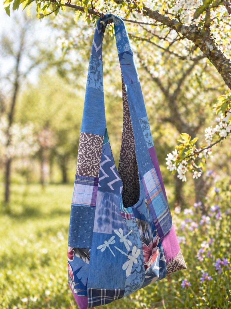 ENGLISH: A spacious hobo bag in patchwork in various shades of blue, purple/wine red, turquoise, and off-white. Completely unique and also reversible! The inside is entirely made of the gray-purple fabric with a ditsy floral pattern and has a pocket. In the picture further down, the other side of the bag can be seen. The bag has also been decorated with a stencil print of dragonflies on both sides.