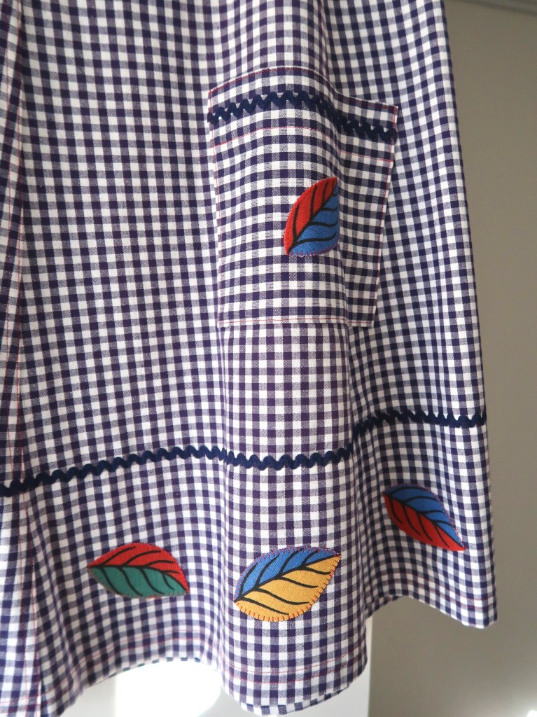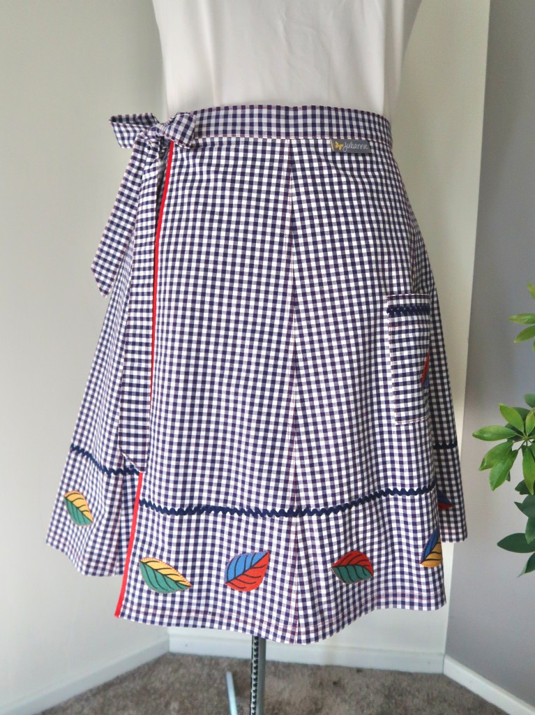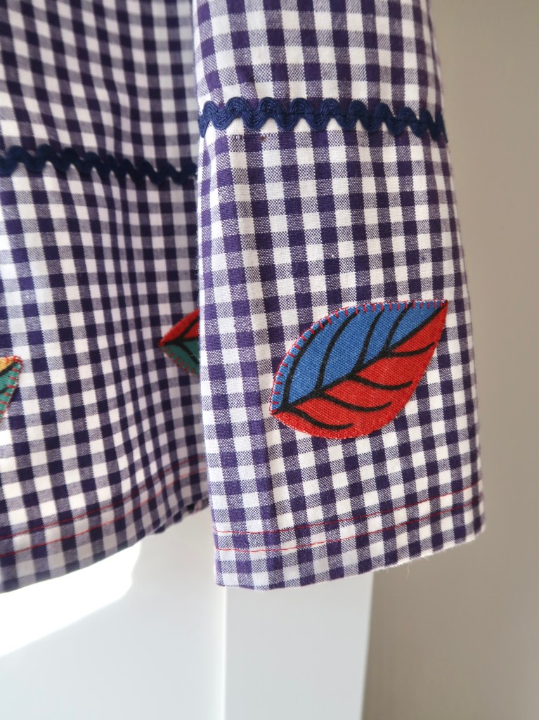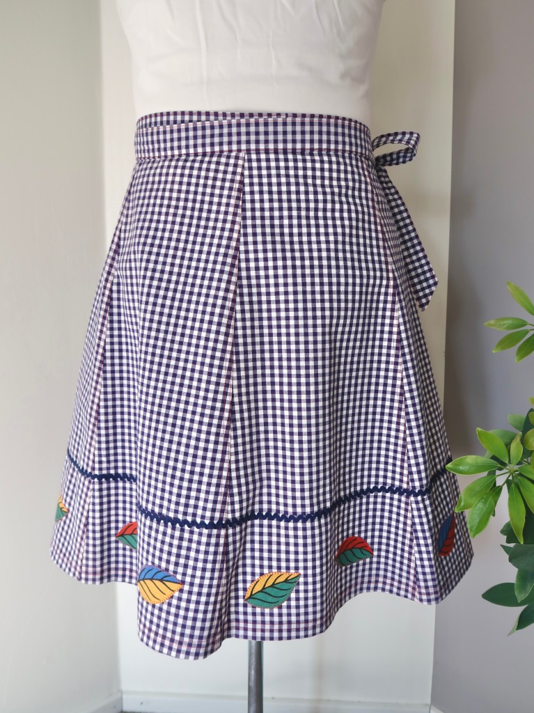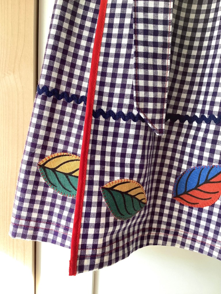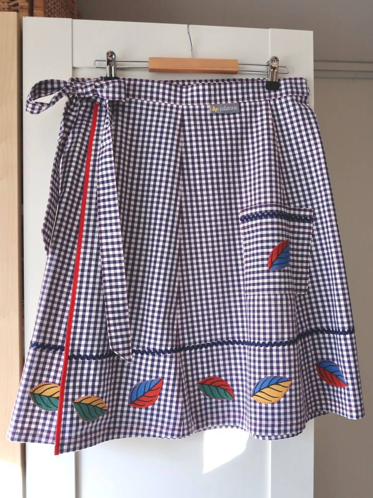 ENGLISH: Erika is the skirt for those who like it a little more classic, simple! A gingham checkered cotton in blue and white, zigzag ribbon in blue, binding and knitting in red and appliqués in the basic colours along the bottom.
