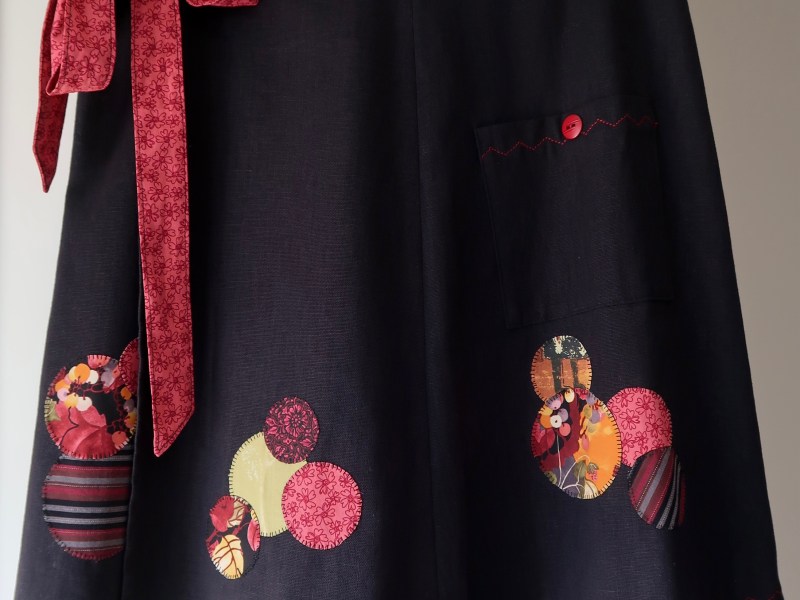 The skirt overlaps and the tie is threaded through a buttonhole in the waistband on the right side, goes behind the back and is tied in a bow on the left side. The pocket is located on the right side.