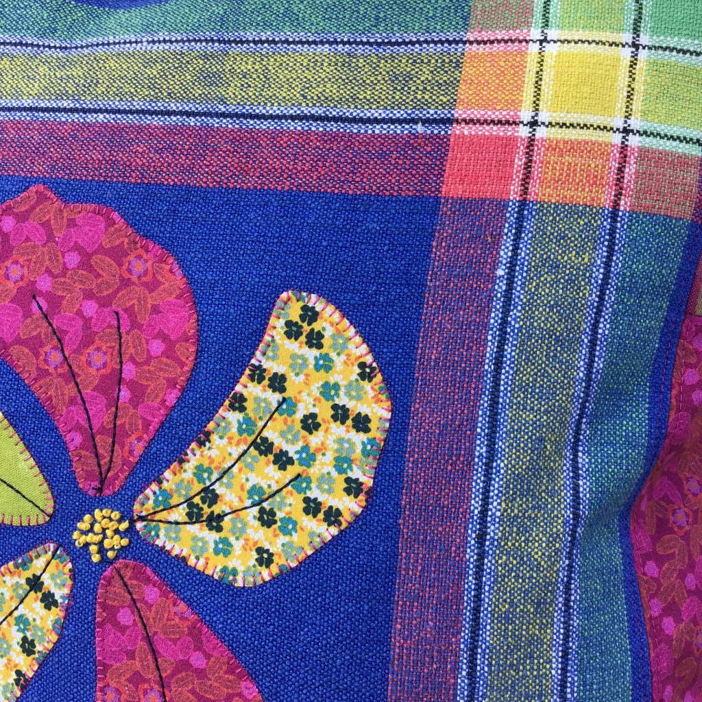 Bright lovely colors where a recycled blue small tablecloth with woven stripes/checks has been given new life with appliqués and a little embroidery and surrounded by matching cotton fabrics.