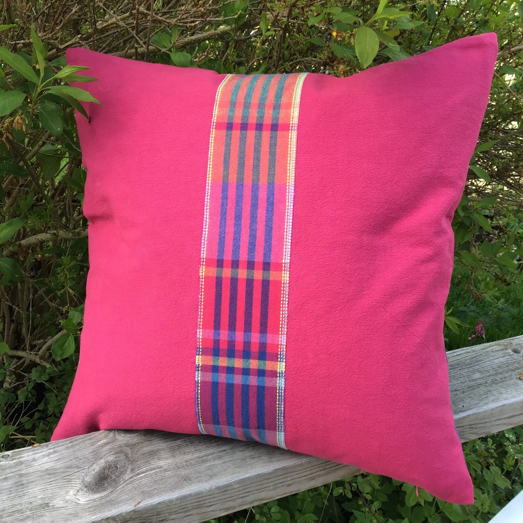 Baksidan är en enfärgad cerise bomullscanvas med en dekorativ infällning i framsidans färger.