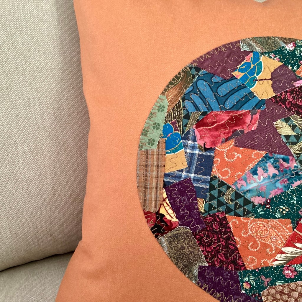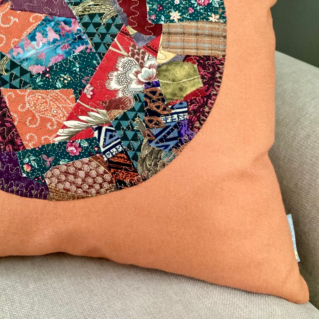 ENGLISH: Gaia was the name of Mother Earth in Greek mythology and it was quite natural to name this beautiful pillow after that. The large circel is made of many small pieces in different colors and shapes, just like us humans. And together they form a beautiful unity on the sunset-coloured background that consists of nice and soft wool felt. All the textiles included are remnants, leftovers and scrap bits.