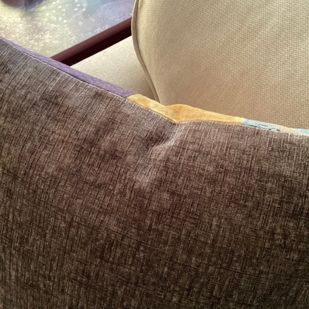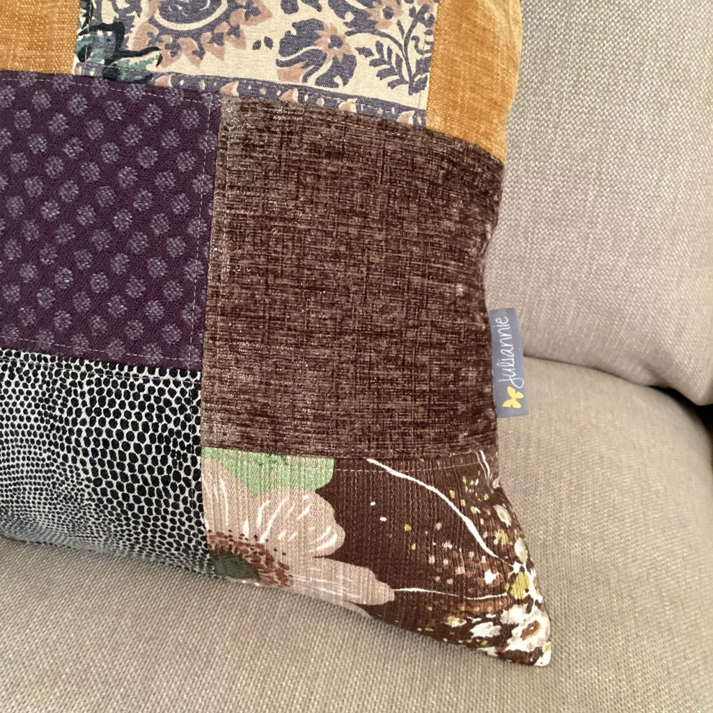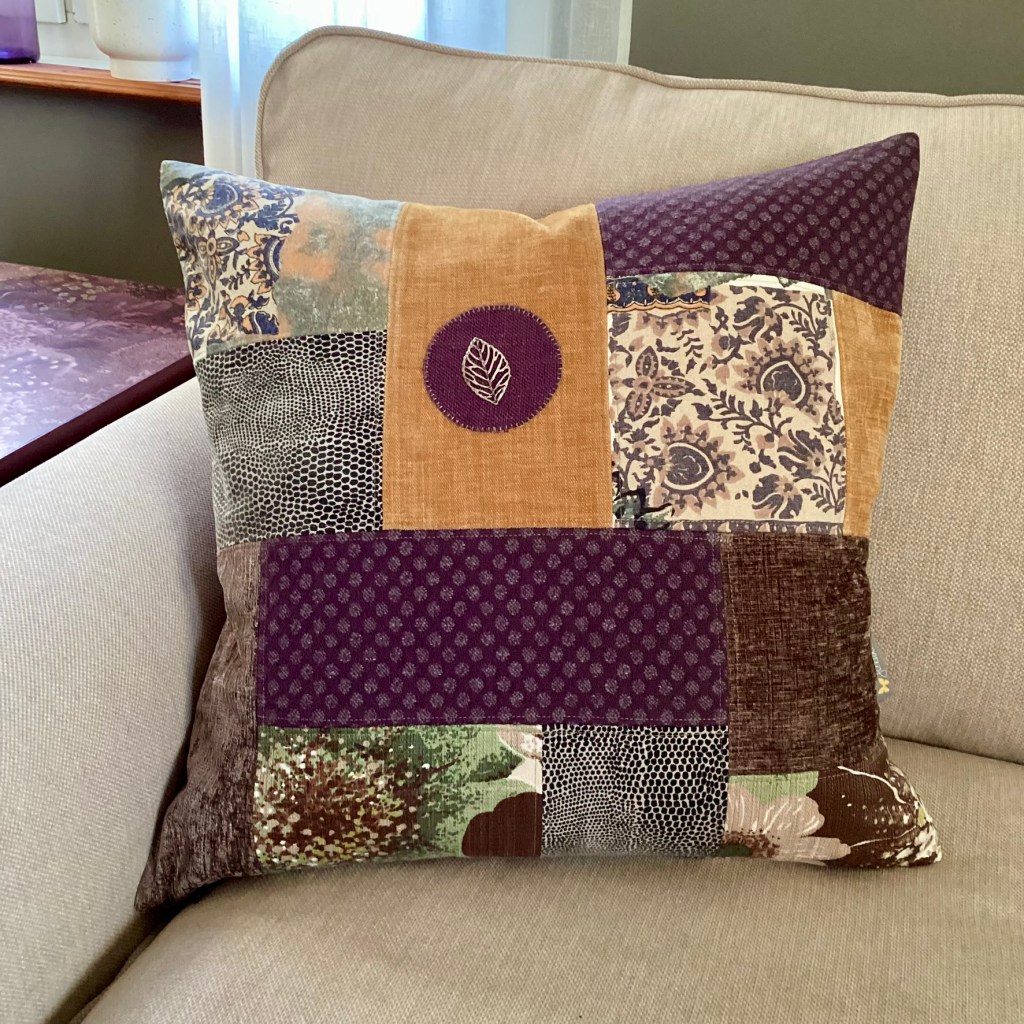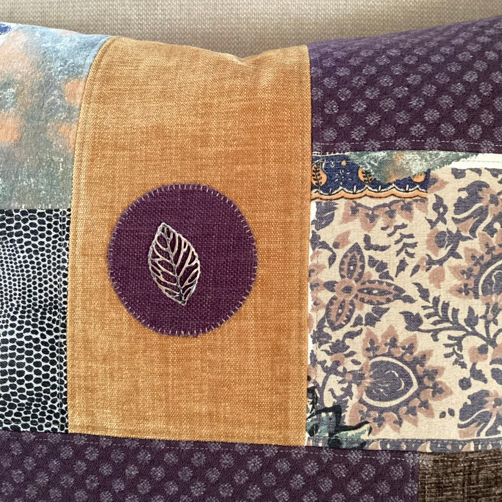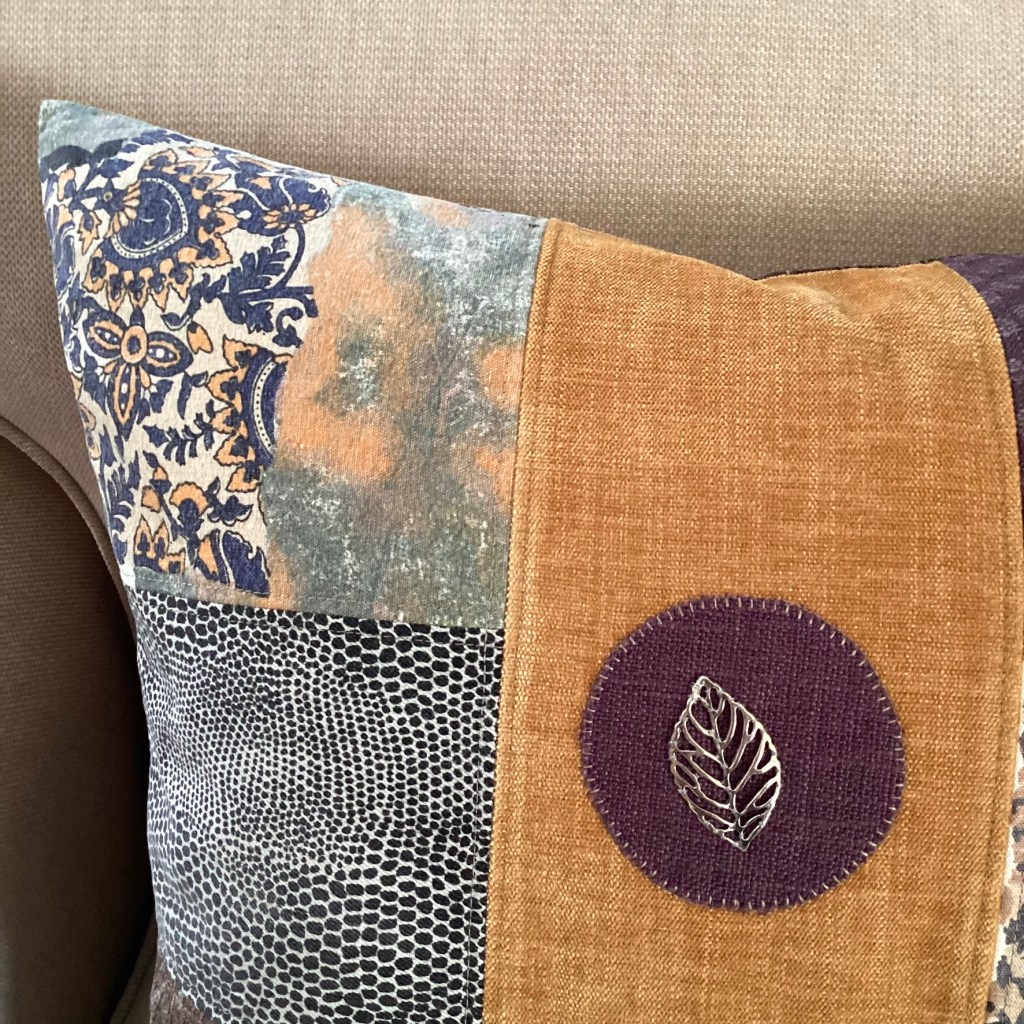 ENGLISH: The Heather pillow is inspired by nature in autumn, bark, heather, yellow leaves – gentle, soft colors in calm harmony. The materials consist of both soft and smooth upholstery velvet and chenille and slightly rougher wool. A nice little detail is an openwork leaf in oxidized silver metal. As always, all the textiles included are preloved and leftovers.