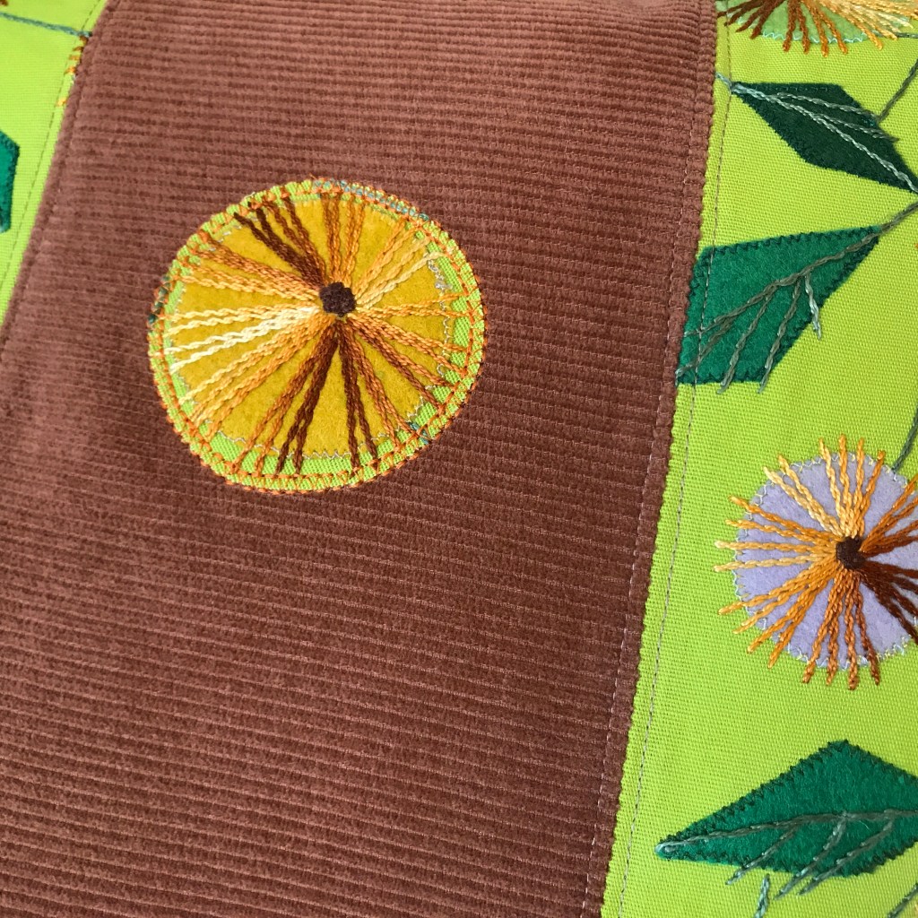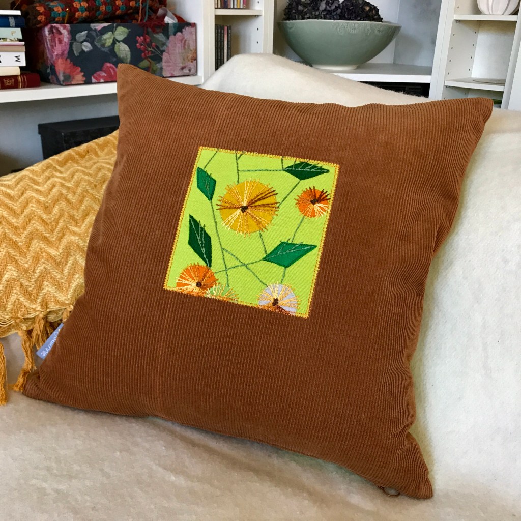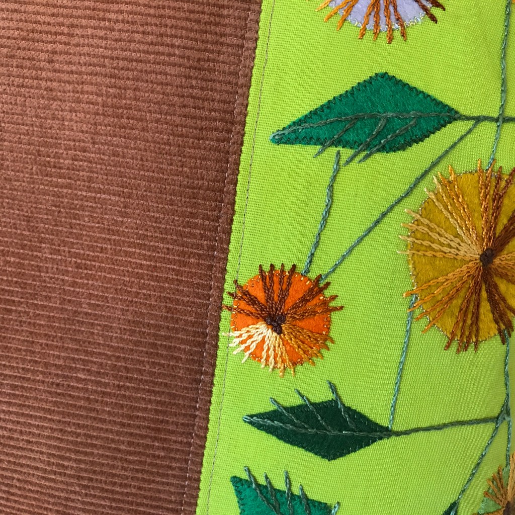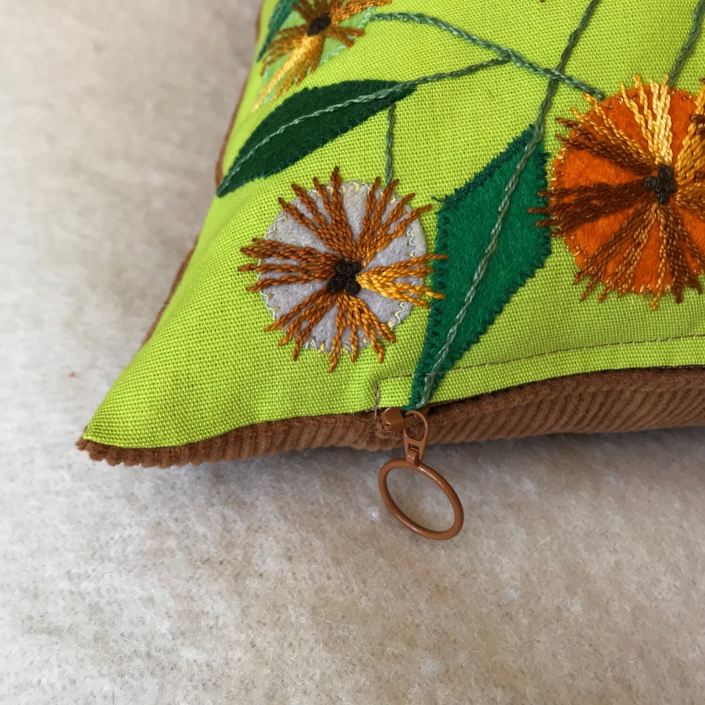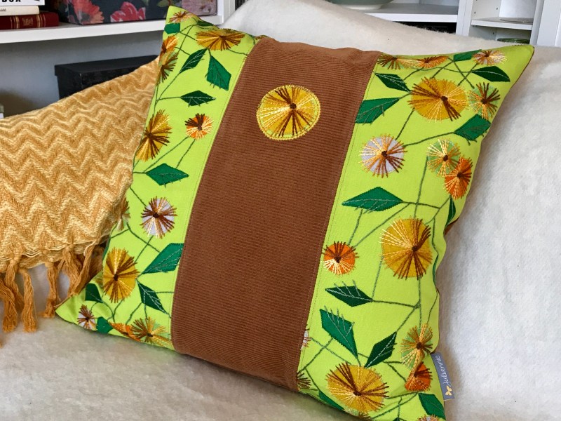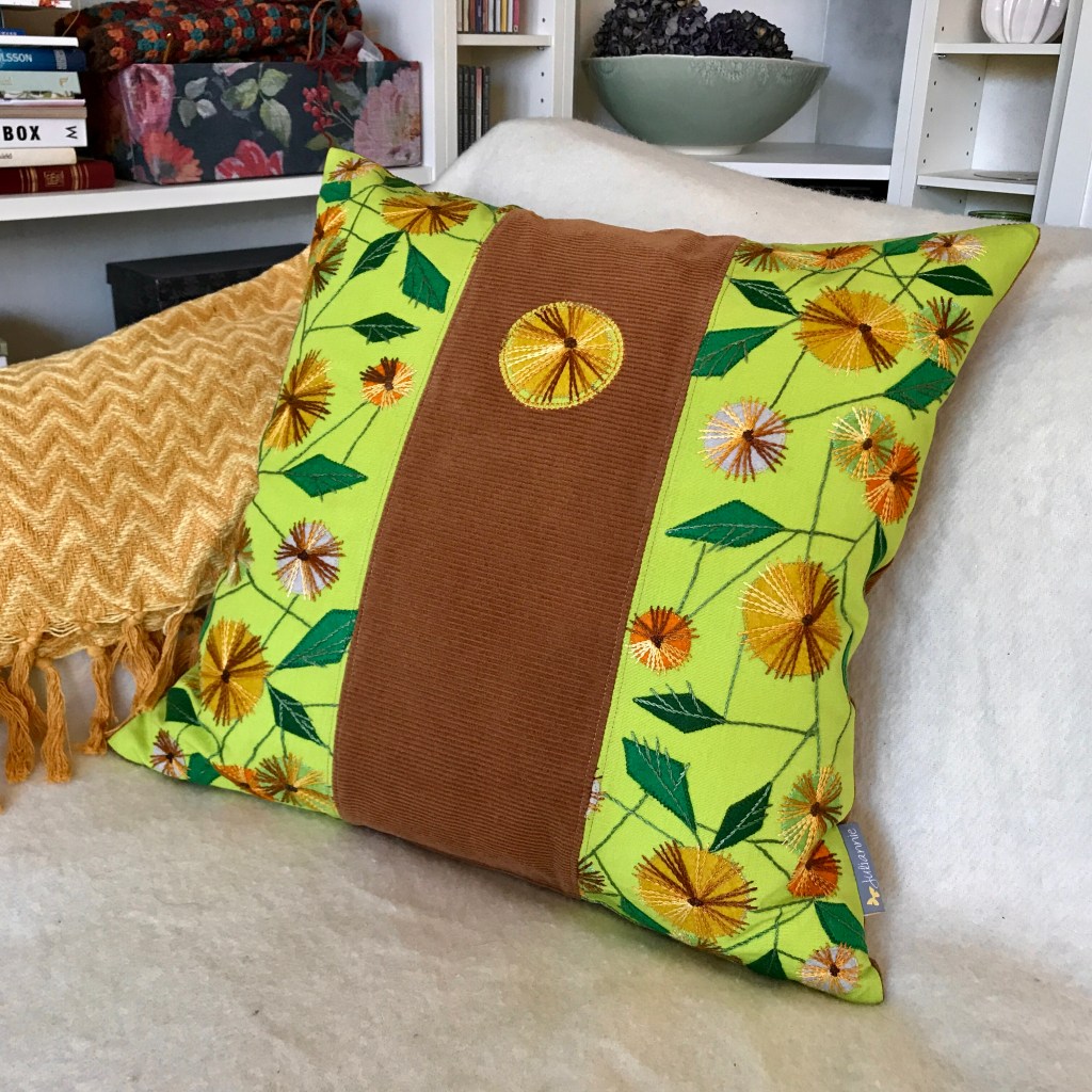 60’s-70’s vibes! And it was named after the Beatles’ old classic from 1967 as well – Penny Lane. Brilliant lime green cotton fabric with a stunning hand-embroidered motif with felt appliqués, combined with a soft, caramel brown corduroy. A unique pillow that really brightens up the sofa!