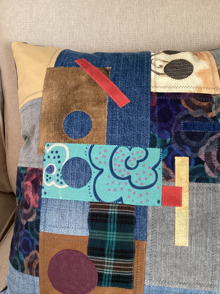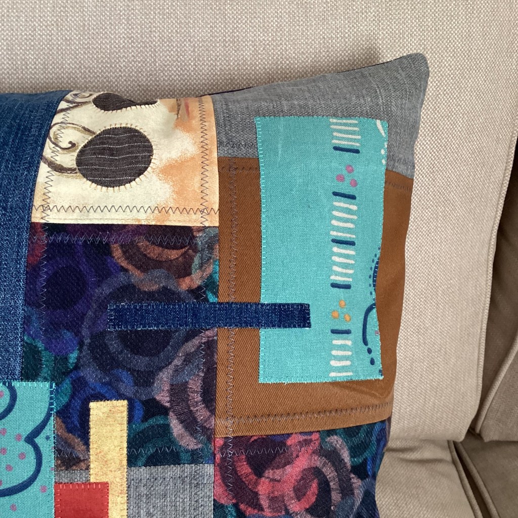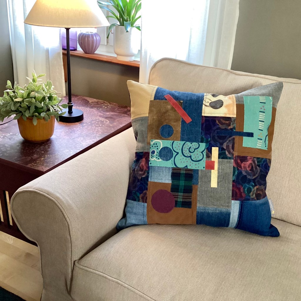Rustika textilier i mustiga färger – ett patchwork och applikationsarbete i denim, bomullstwill, möbeltyg och lite annat i blått, kanelbrunt, grått och så lite ”utropstecken” i gult, turkost och rött. Sammantaget en användarvänlig, härlig kudde att lysa upp soffan med! Som alltid är alla ingående textilier återbruk och spillbitar.