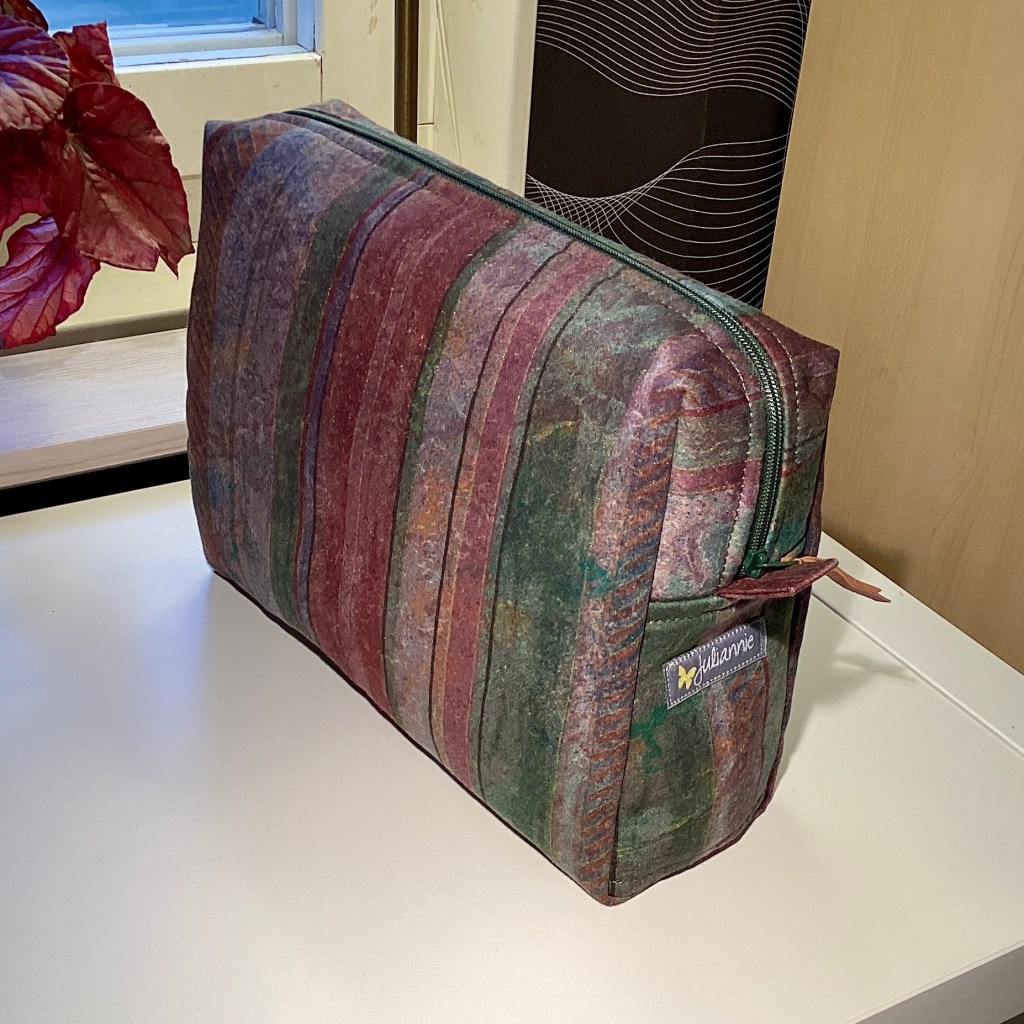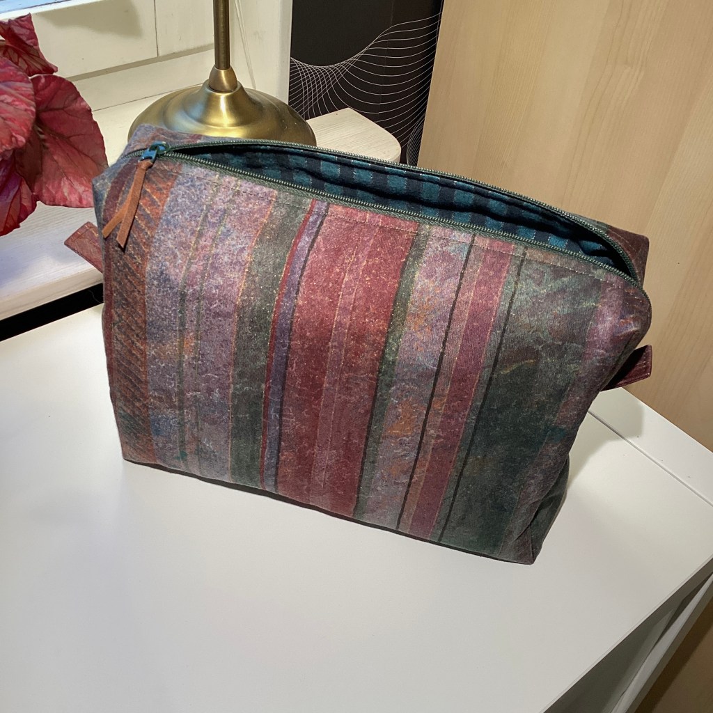 En lite lagom stor necessär i en form som tillåter flaskor och tuber att stå upp, lite bredare i botten än upptill. Höjden är 18 cm. Den är sydd av ett vackert tyg med abstrakta ränder i mjuka, diffusa toner av grönt, blått och vinrött och med ett mörkgrönt blixtlås. Fodret är smalrandigt i två toner av turkos eller petrol och har en mjuk borstad yta och där finns en innerficka.