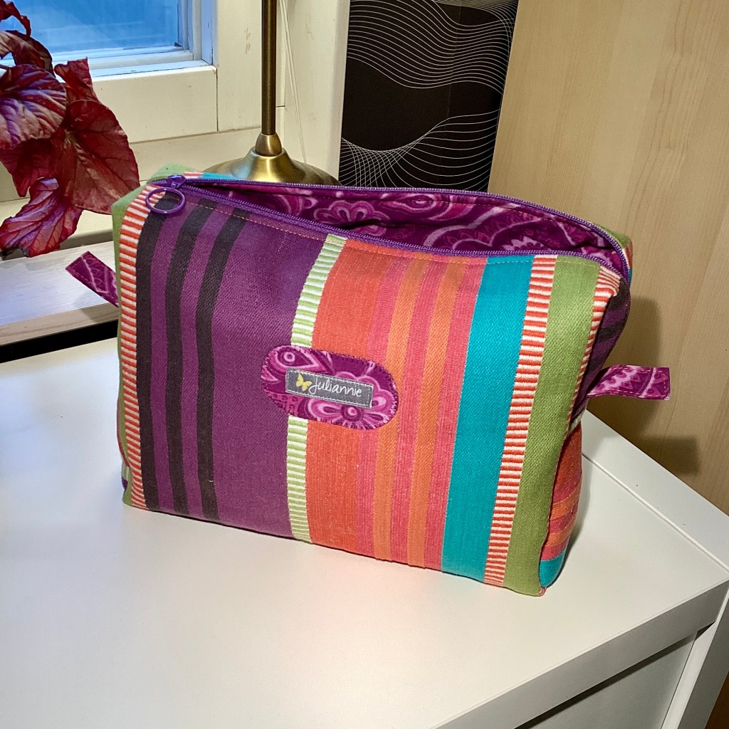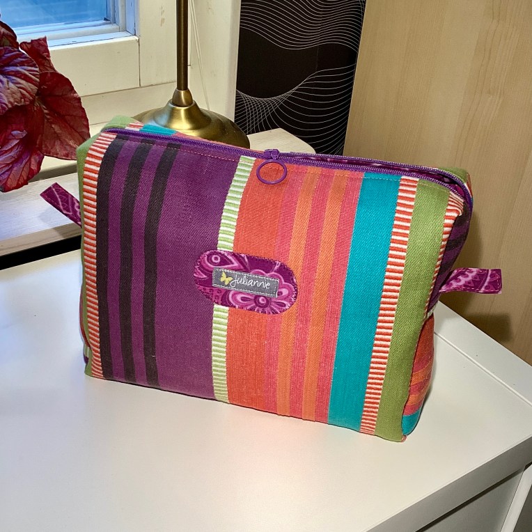 En lite lagom stor necessär i en form som tillåter flaskor och tuber att stå upp, lite bredare i botten än upptill. Höjden är 18 cm. Den är sydd av ett härligt ”karamellrandigt” bomullstyg i en stadig kvalitet. Fodret är paisleymönstrad bomull i lila/cerise/rosa toner och har en innerficka. Blixtlåset är lila med en ring som kläpp.