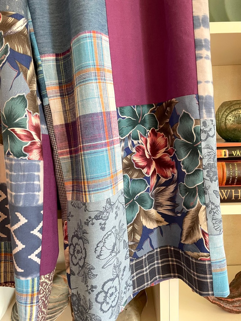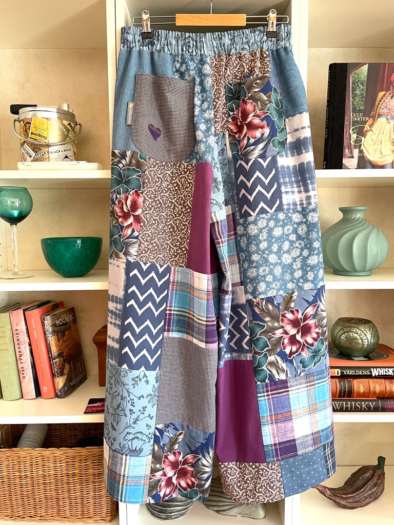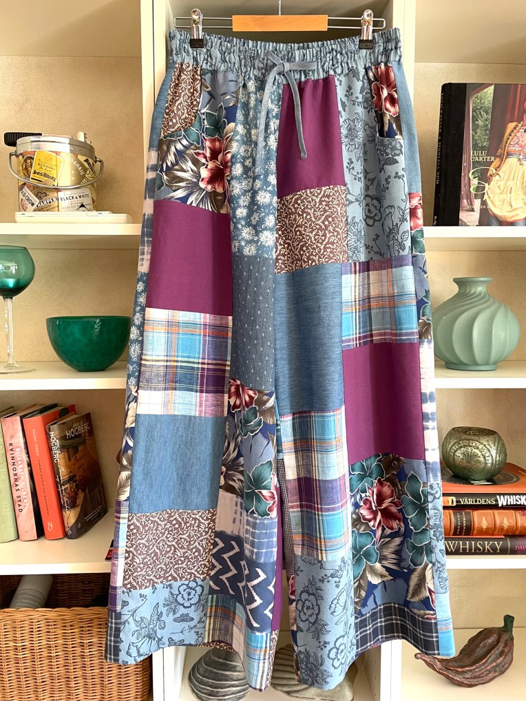 Ett par patchworkbyxor med riktigt vida ben, resårmidja med knytband, djupa härliga fickor fram och två bakfickor! Färgskalan är olika blå nyanser, lila/vinrött, turkos och offwhite. Materialet genomgående bomull och linne med något inslag av viskos.