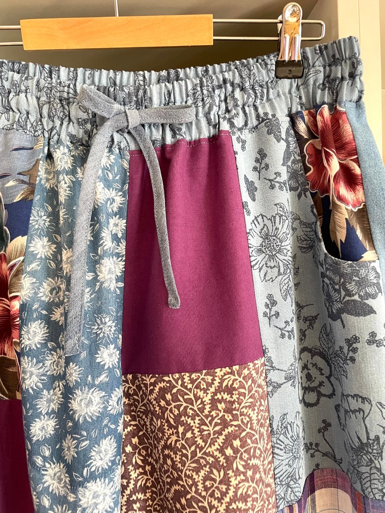 ENGLISH: A pair of patchwork pants with really wide legs, elastic waistband with drawstring, deep lovely pockets in the front and two back pockets! The color scheme is different shades of blue, purple/wine red, turquoise, and off-white. The material is cotton and linen with some viscose.