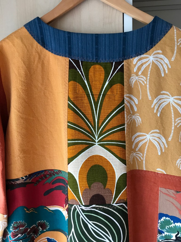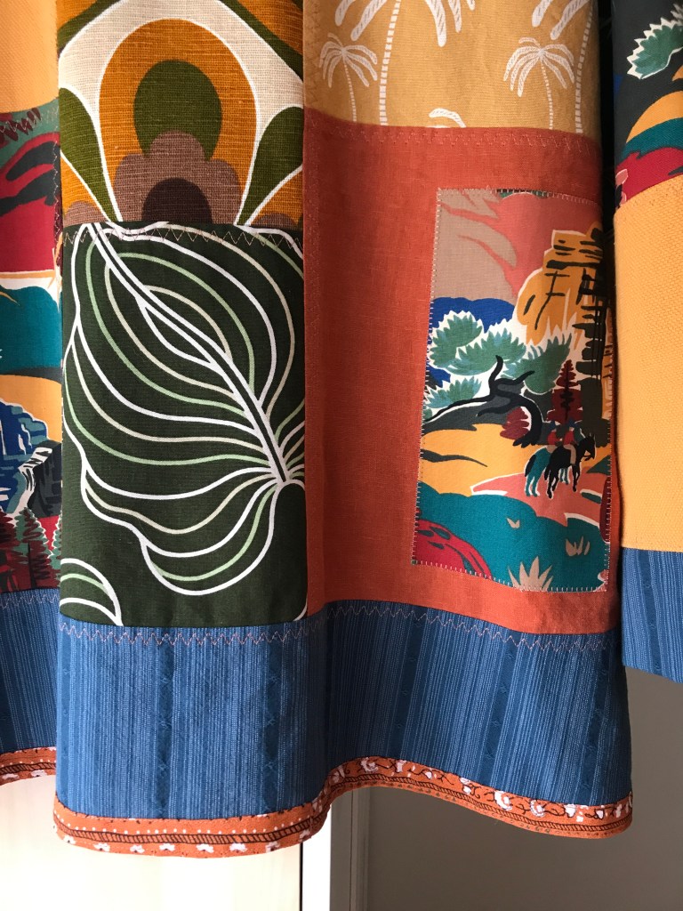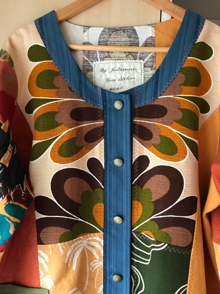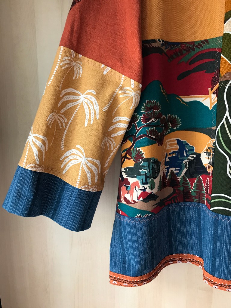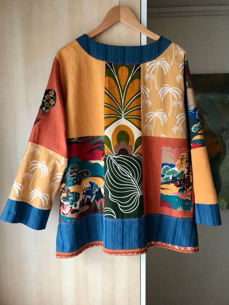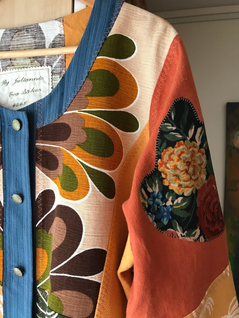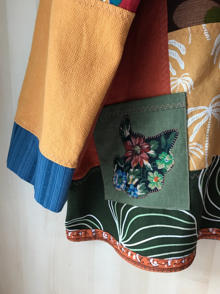 Två unika tryck har fått vara utgångspunkter för färgskalan i den här jackan. Ett med inspiration från kanske Mexiko eller något annat sydamerikanskt land, och ett äkta retrotryck från 50-60-tal. Materialen är bomull och linne med lite olika struktur och känsla. Alla ingående textilier är återbruk och spillbitar som alltid.