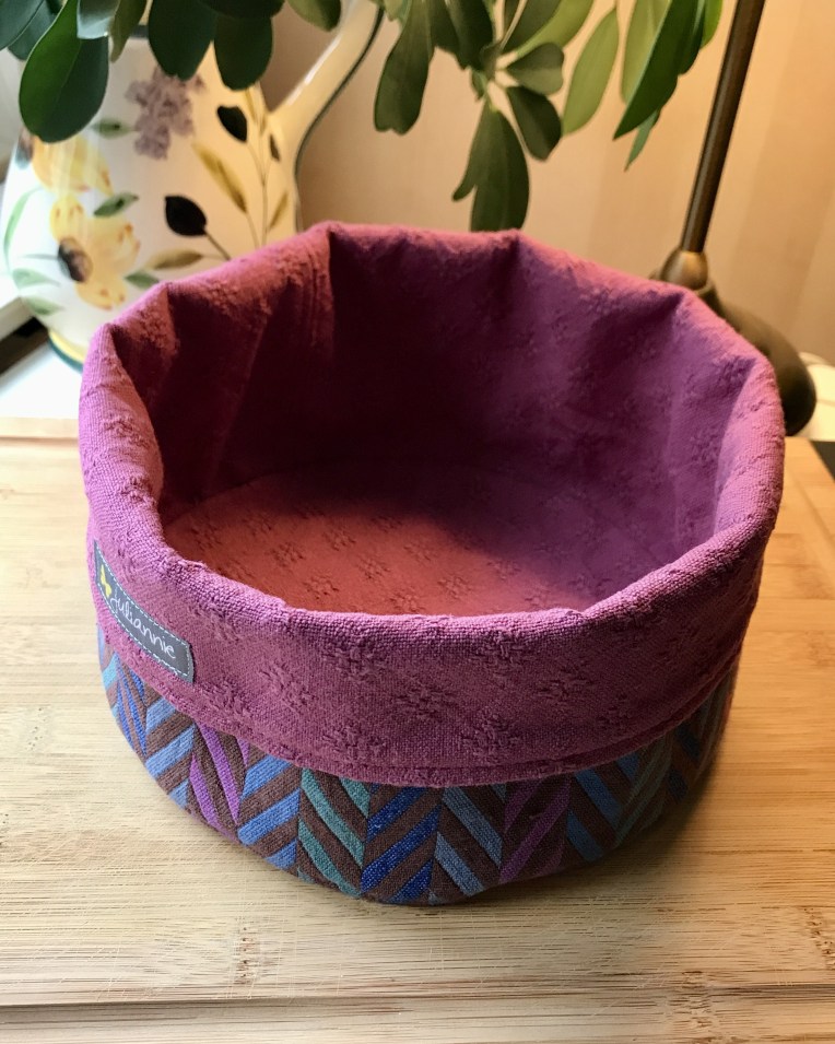 ENGLISH: A nice useful fabric basket that is suitable for both breakfast rolls and pastries or for storing items in the bedroom, bathroom, or wherever you want. The edge can also be folded up, making the basket 15 cm tall. The outside is a beautiful chevron-patterned, slightly thicker fabric in blue, fuchsia, brown, and green, and the inside is made of structured woven cotton fabric that matches the fuchsia color of the outer fabric. The edge can also be turned up and that will make the basket 15 cm (6″) high.