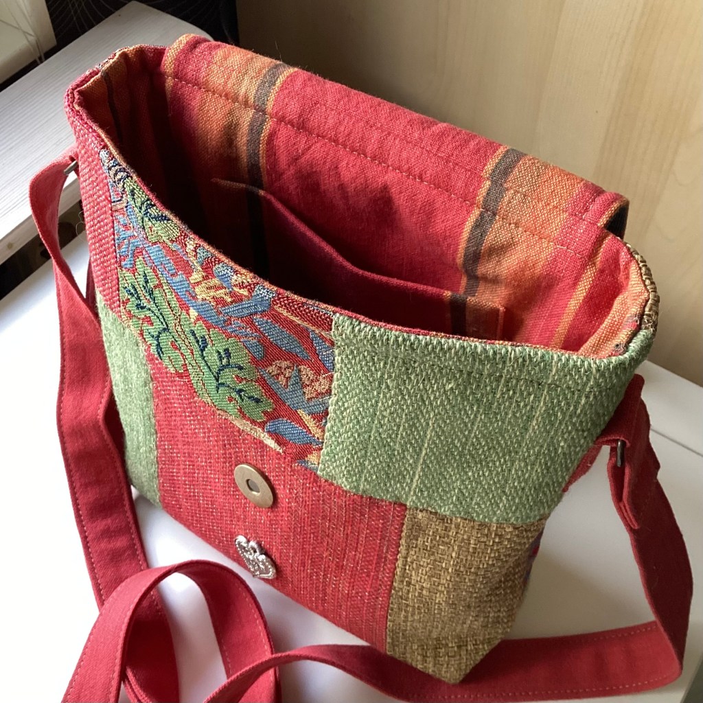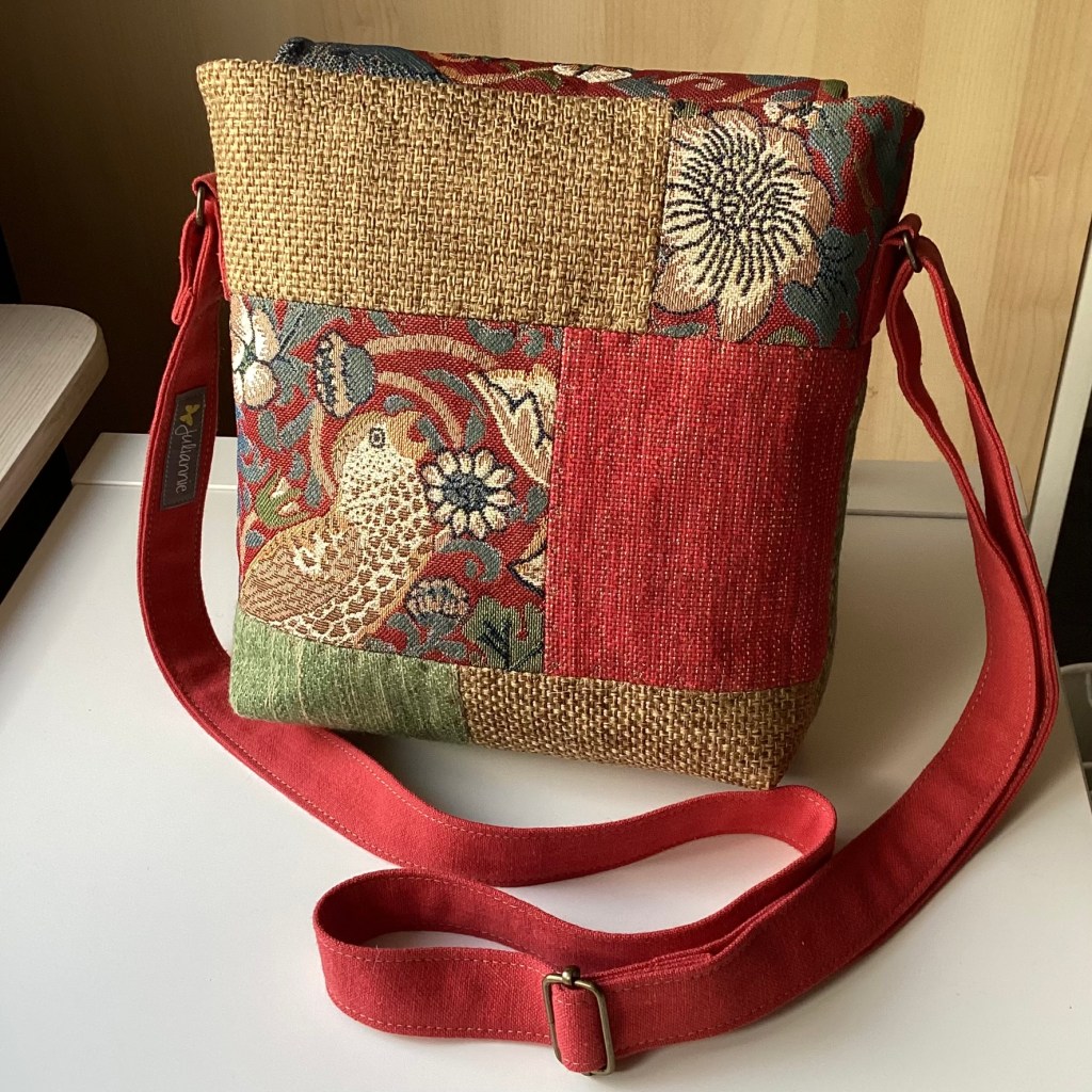ENGLISH: A shoulder bag where the lovely fabric ”Strawberry Thief” by William Morris has been given a prominent place, on the lid and also the back. The colours have been matched with pieces of upholstery fabric in warm red, green and straw yellow and the lining in Indian cotton also matches nicely. A small heart in silver metal is sewn on as an extra nice decorative detail on the front.