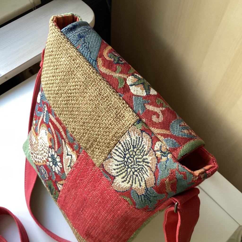 En axelremsväska där det ljuvliga tyget ”Strawberry Thief” av William Morris fått en framträdande plats, på locket och även baksidan. Färgerna har tagits upp med bitar av möbeltyg i varmrött, grönt och halmgult och även fodret i indisk bomull matchar fint. Ett litet hjärta i silvermetall är fastsytt som en extra liten fin dekordetalj på framsidan.