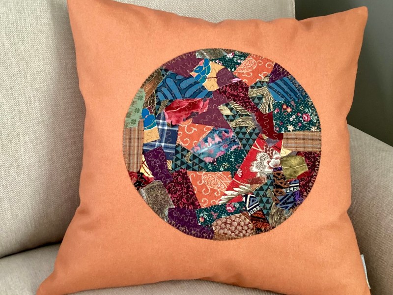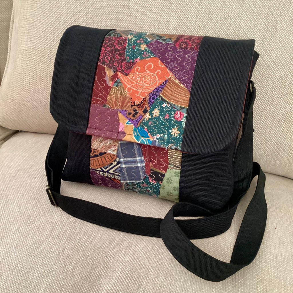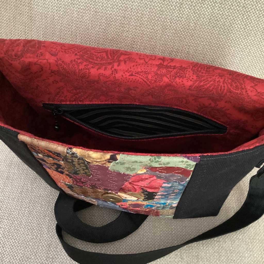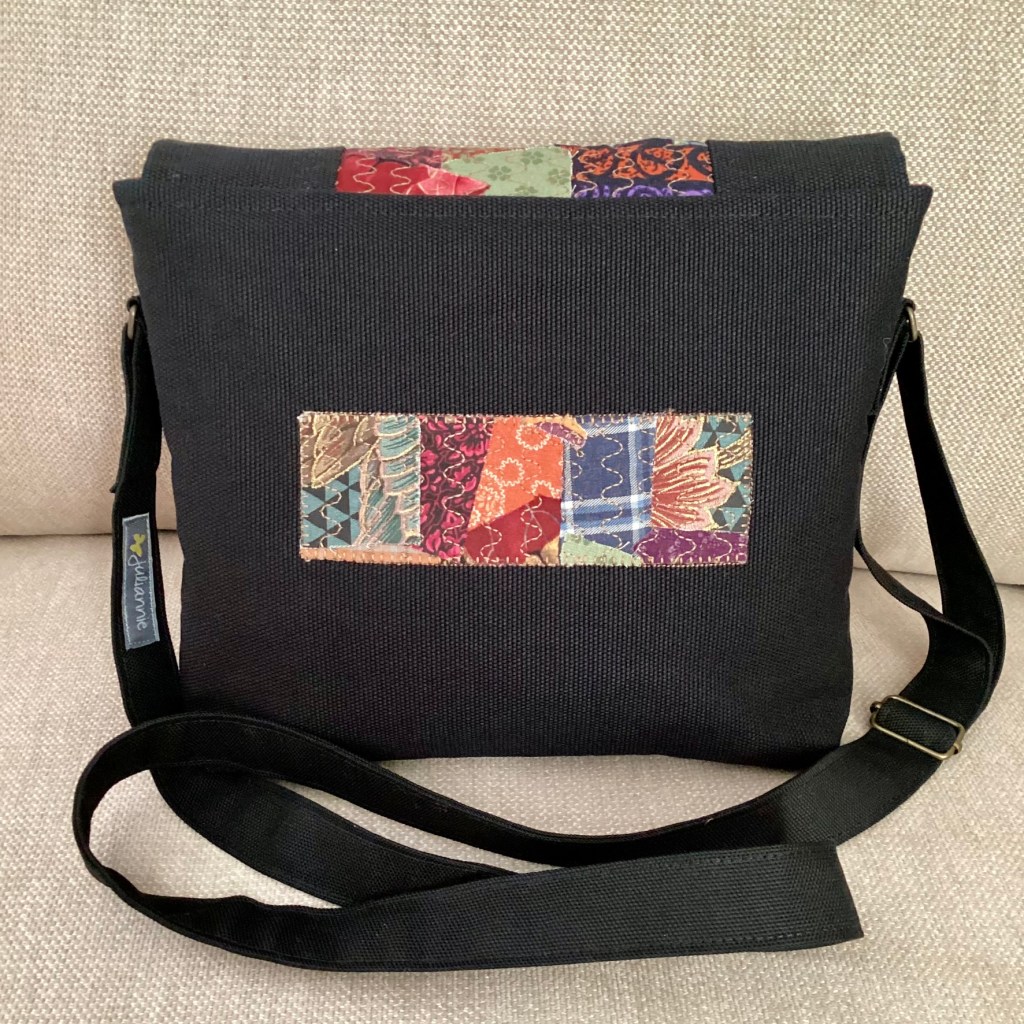 En axelremsväska i svart kanvas med ett infällt parti med patchwork av småbitar i mustiga färger på lock och framsida. Baksidan har fått en mindre bit patchwork som dekoration. Fodret är mörkrött med ett svagt paislymönster i grafitgrått.