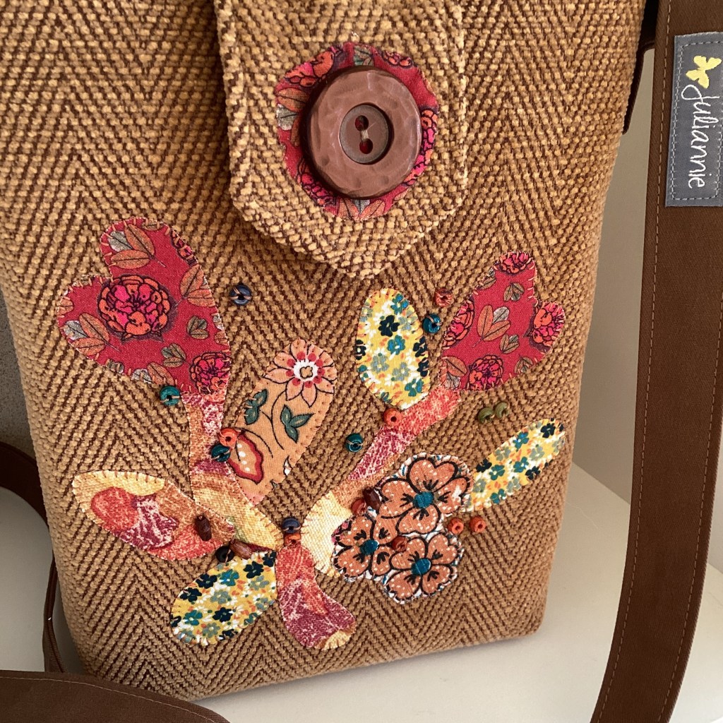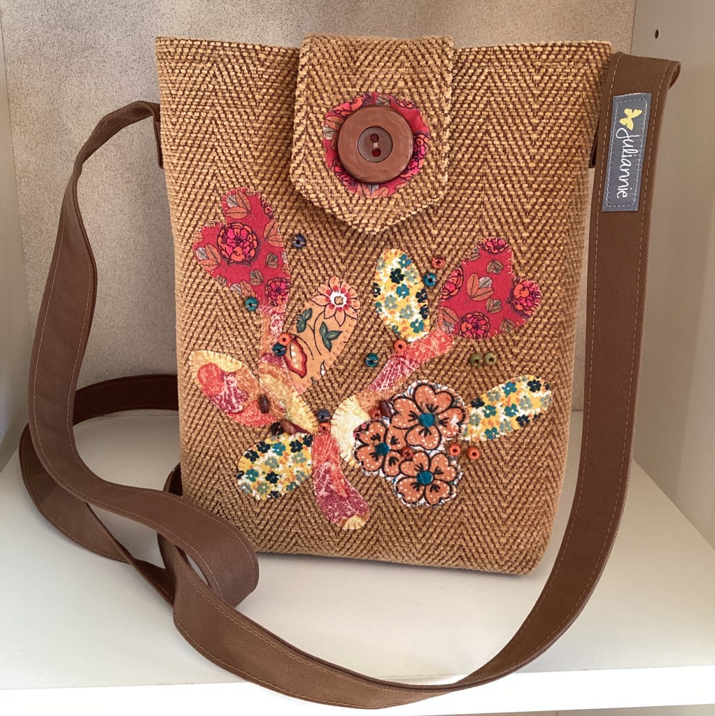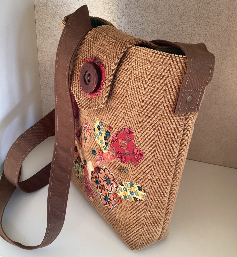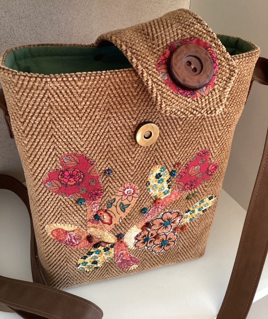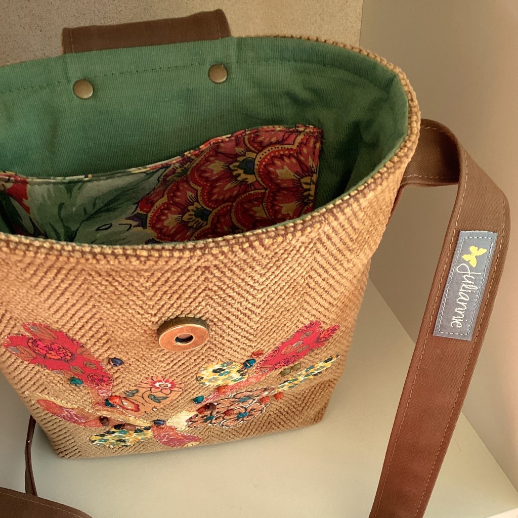 ENGLISH: A beautiful little shoulder bag in lion-yellow chenille with a subtle herringbone pattern. It is decorated with a free-form applique in various warm colors and small sewn-on wooden beads in matching colors. The bag closes with a magnet under the wide flap, so the large retro button is just for decoration. The lining is made of green shirt cotton and has three pockets where both a phone, wallet, and glasses can fit.