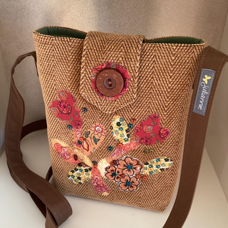 En vacker liten axelremsväska i lejongul möbelchenille med ett subtilt fiskbensmönster. På det en applikation i fri form i olika varma färger och små fastsydda träpärlor i matchande färger. Väskan stängs med en magnet under den breda slejfen så den stora retroknappen är bara till dekoration. Fodret är i grön skjortbomull och har tre fickor där både mobil, plånbok och glasögon får plats.