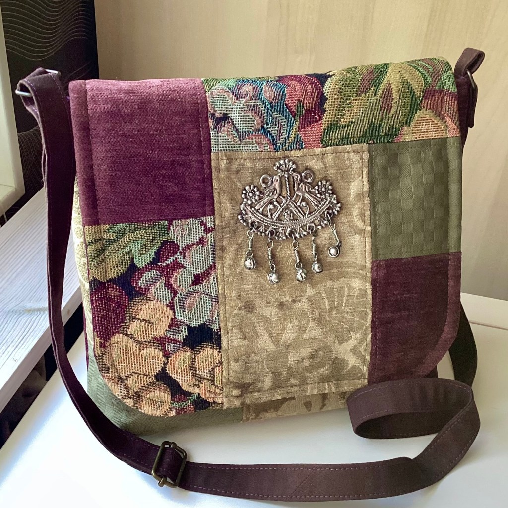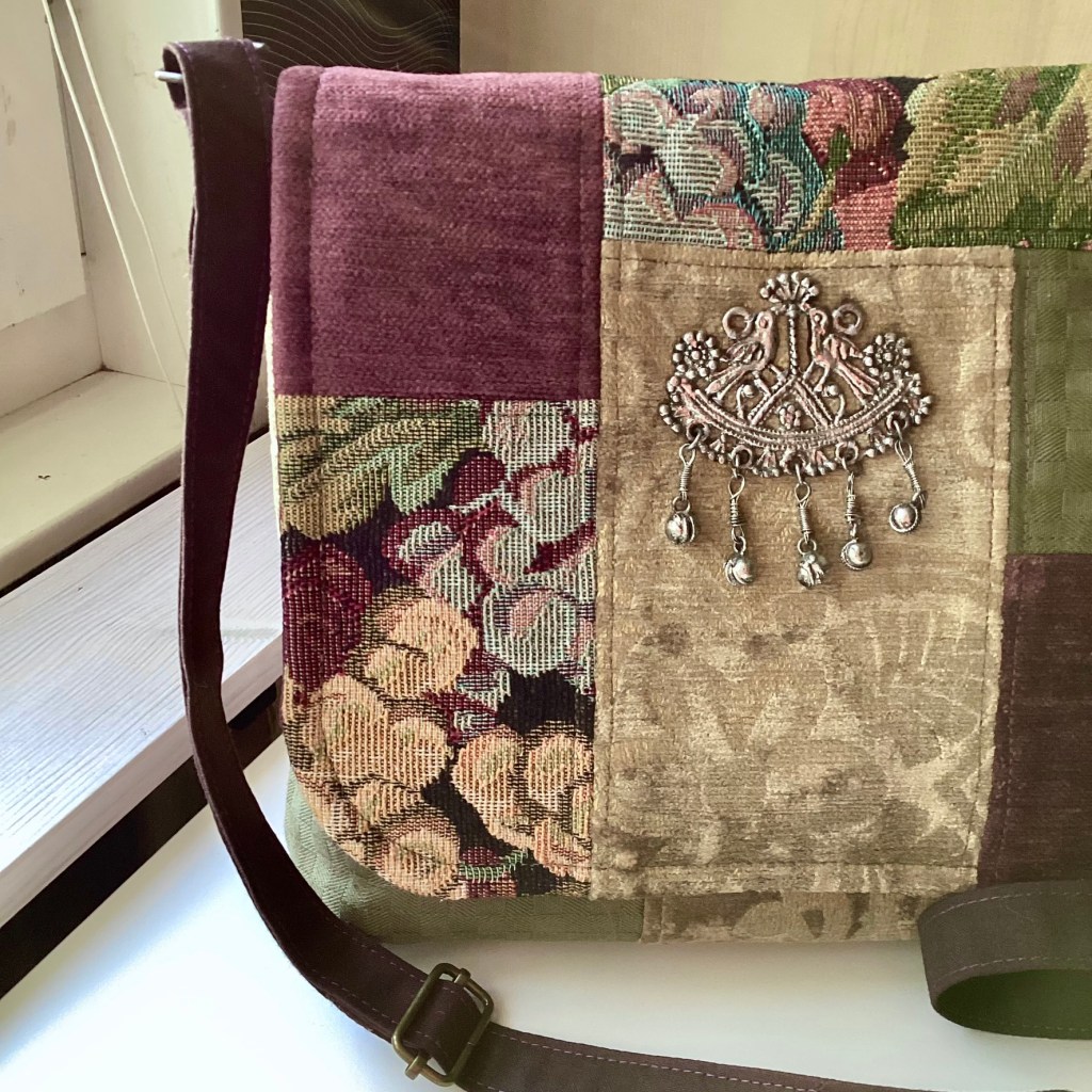 En axelremsväska i patchwork i mjuka, harmoniska färger med en unik detalj – ett hängsmycke i oxiderad silvermetall i fornnordisk stil fastsatt på väskans lock.