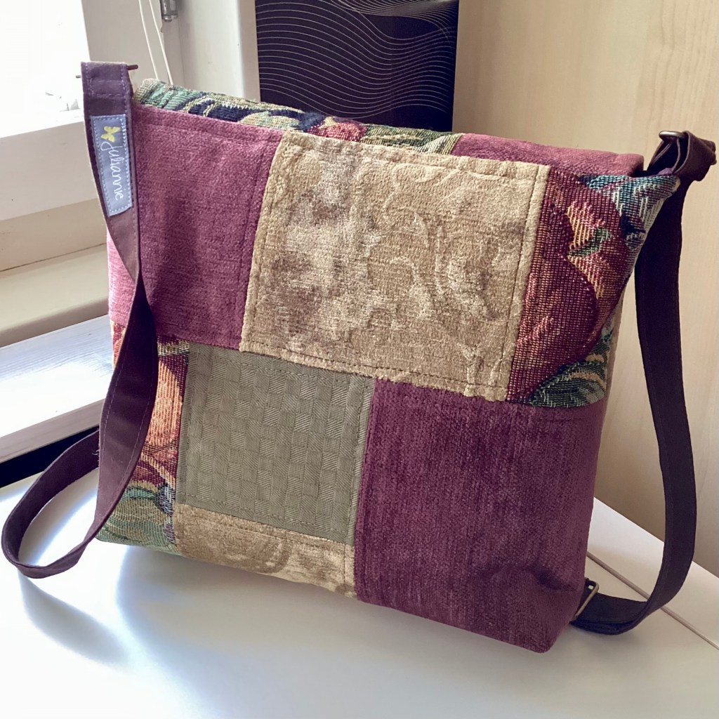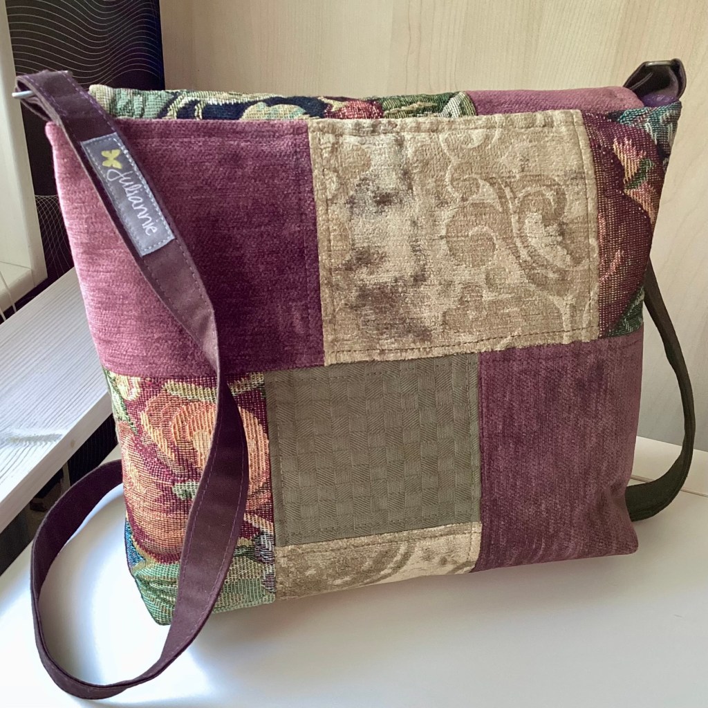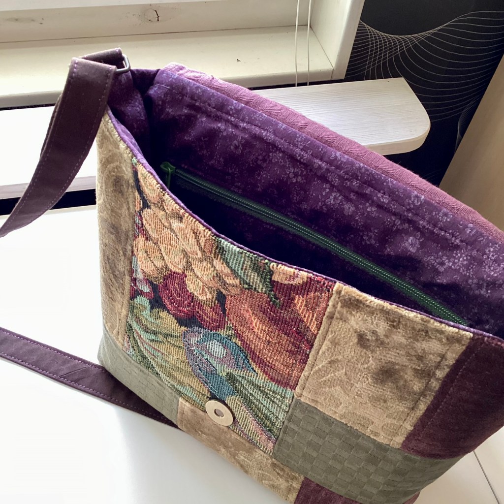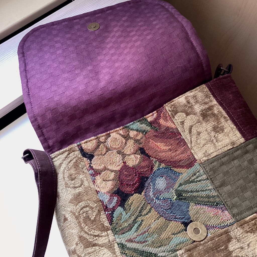 Materialen är bland annat len möbelsammet i plommonlila och guldbeige och jaquardväv med frukter och bär. Ett lock med magnetstängning håller grejerna på plats och inuti finns två fickor varav en med blixtlåsstängning för extra säkerhet. Fodret är ett pytteblommigt bomullstyg i plommonlila och insidan av locket är ett annat plommonfärgat, lite stadigare tyg.