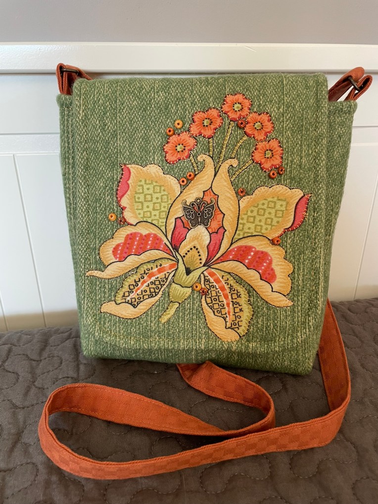 En vacker liten axelremsväska i vårgrönt ulligt möbeltyg med en applikation av en fantasiblomma på locket. Där är också små fastsydda träpärlor i matchande färger och en liten fjäril i bronsmetall. Väskan stängs med en magnet under det långa locket. Fodret är i orange bomull med ett litet mönster i naturvitt. Väskan har tre fickor där både mobil, plånbok och glasögon får plats.