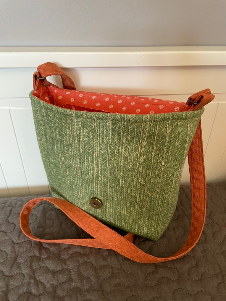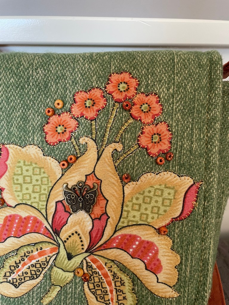 ENGLISH: A beautiful little shoulder bag in spring green woolly upholstery fabric with an appliqué of a fantasy flower on the flap. There are also small sewn-on wooden beads in matching colors and a small butterfly in bronze metal. The bag closes with a magnet under the long flap. The lining is in orange cotton with a ditsy pattern in offwhite. The bag has three pockets where both mobile, wallet, and glasses fit.